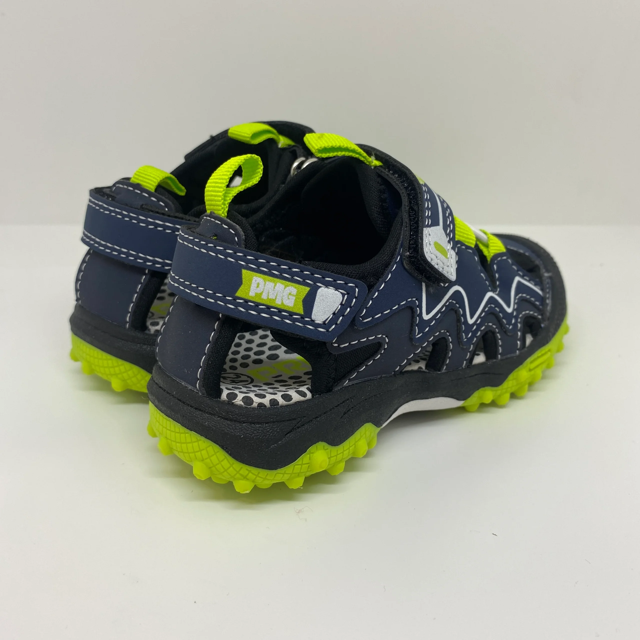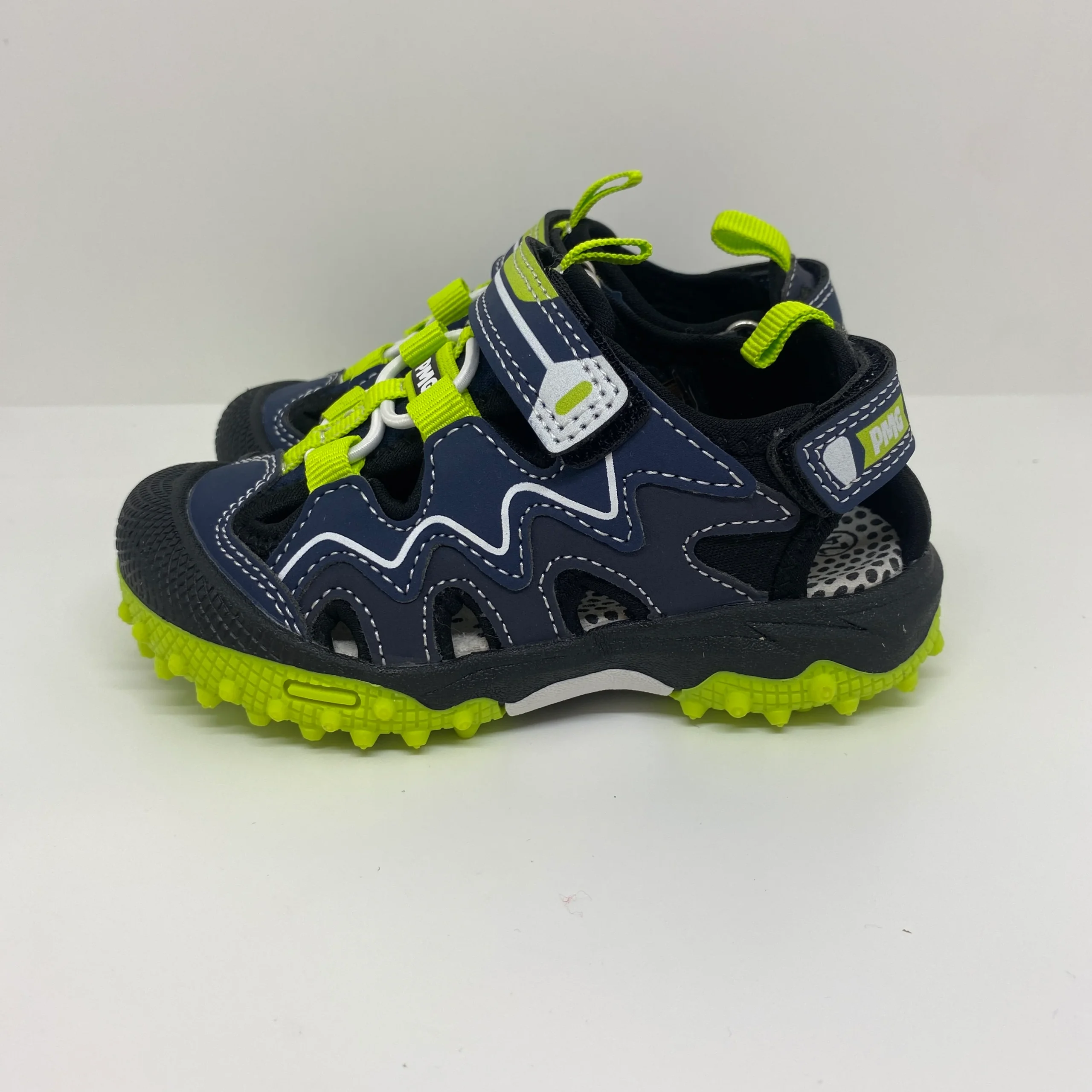 Sandales à bouts fermés, et embouts renforcés, à fermeture velcro au niveau de la bride et sur l’arrière de la chaussure, avec des empiècements en textile et en synthétique.