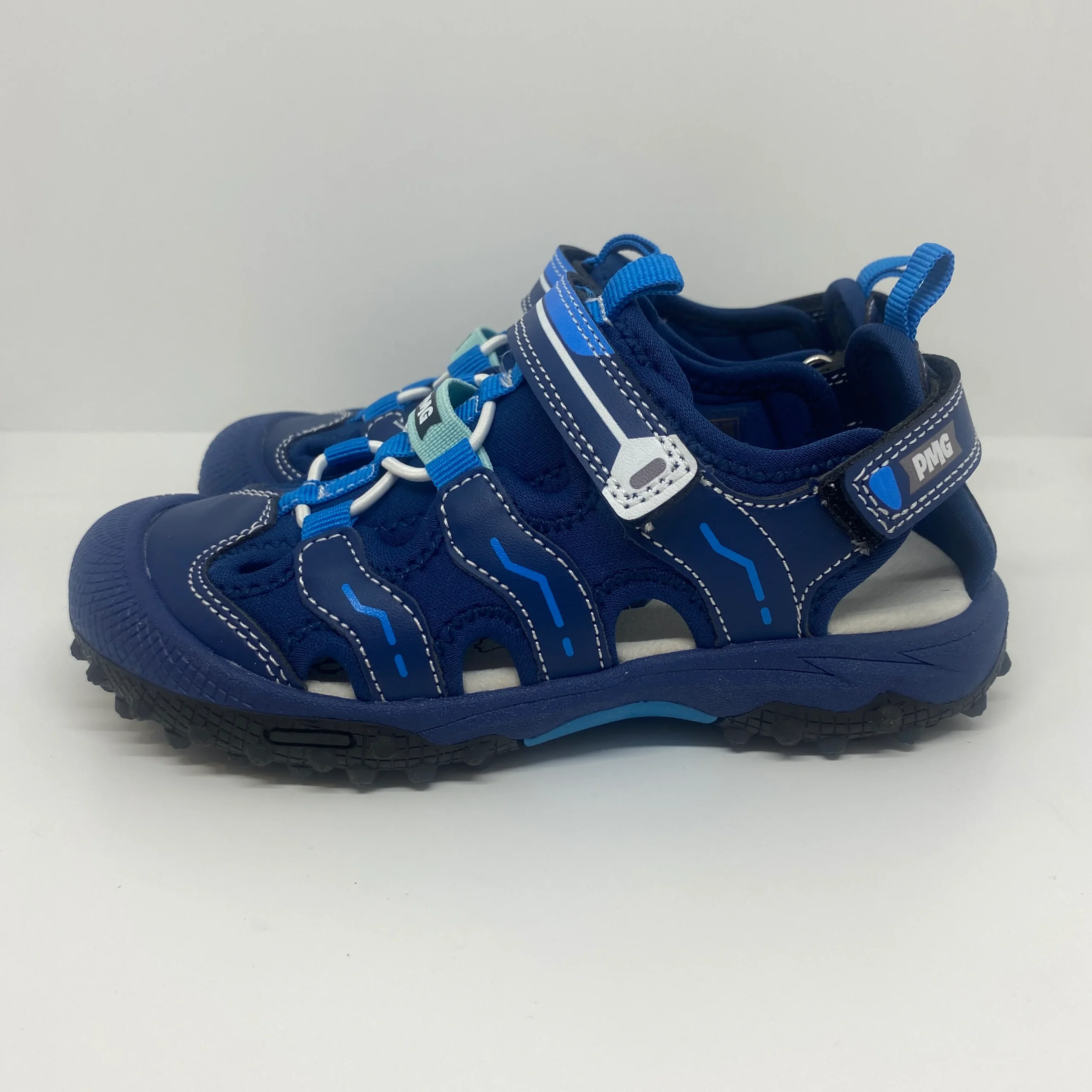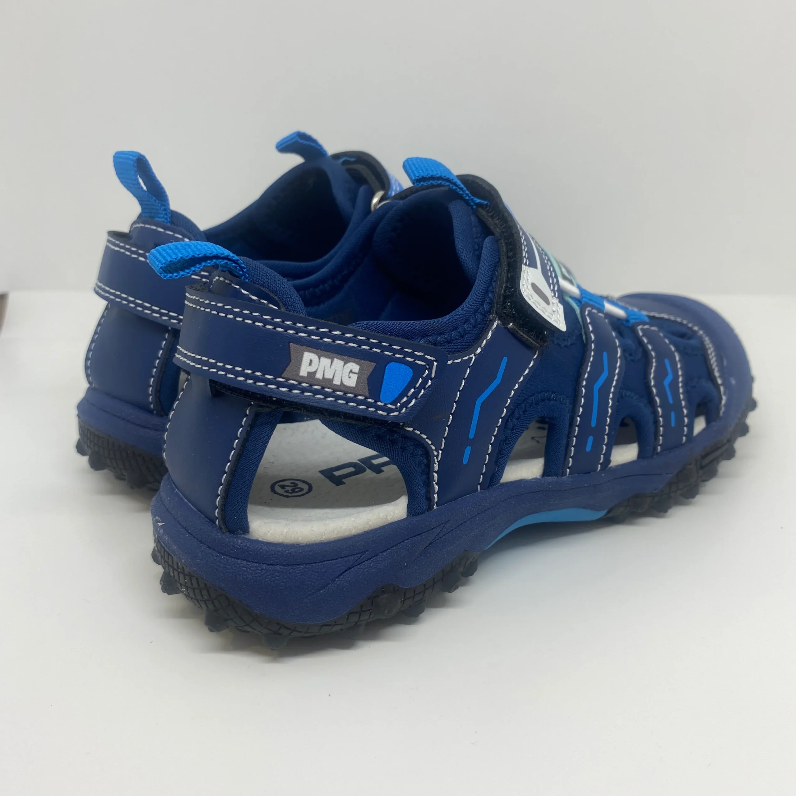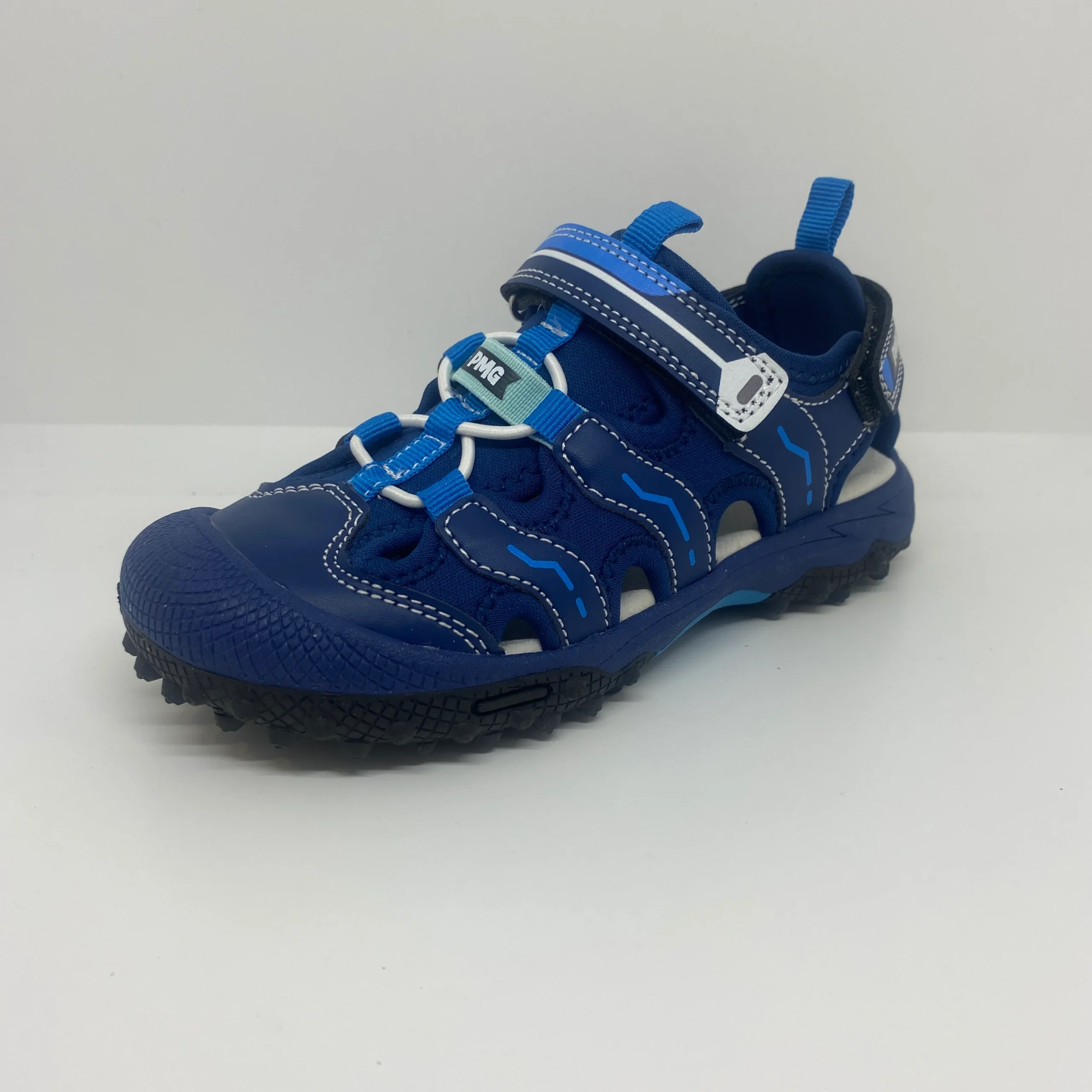Sandales à bouts fermés, et embouts renforcés, à fermeture velcro au niveau de la bride et sur l’arrière de la chaussure, avec des empiècements en textile et en synthétique.