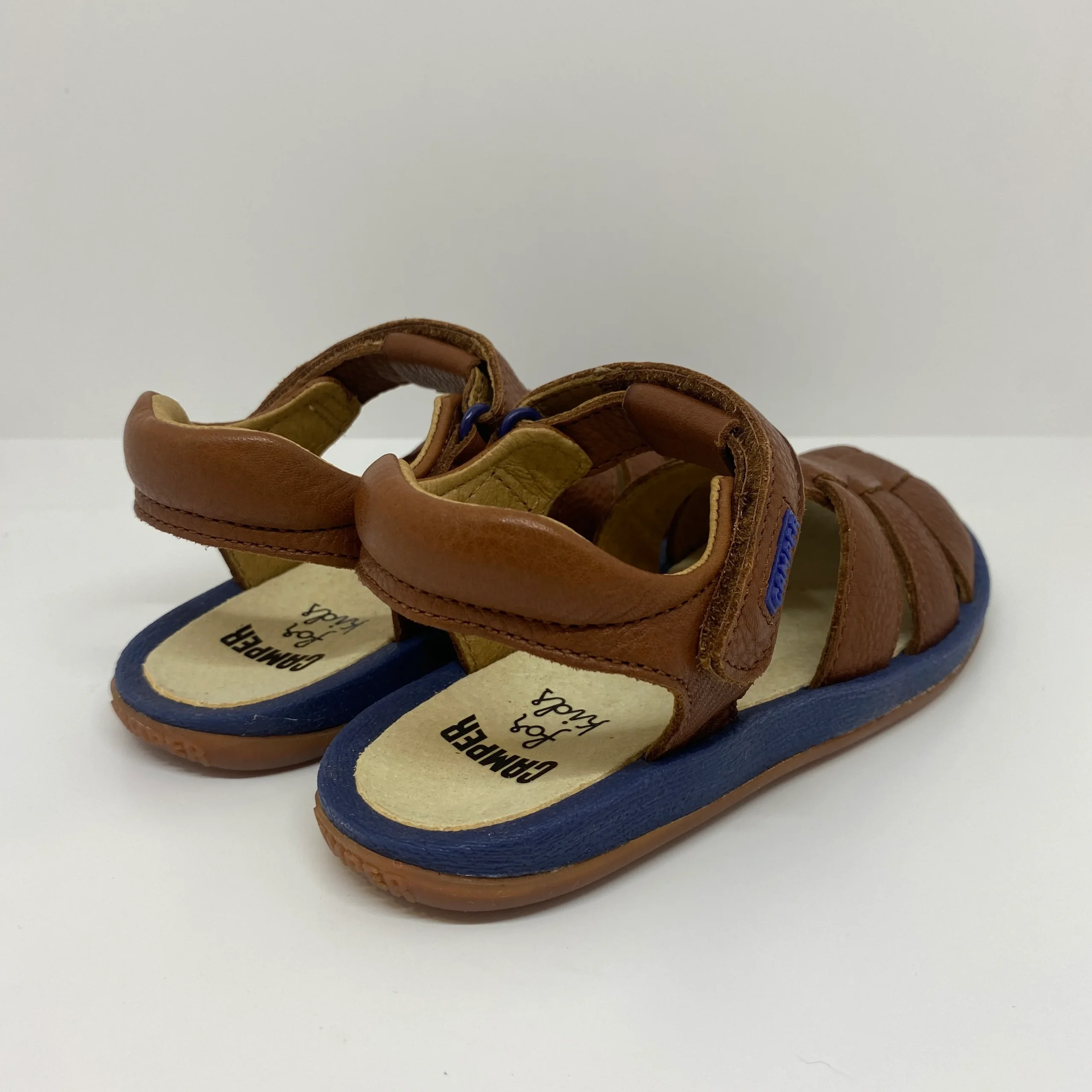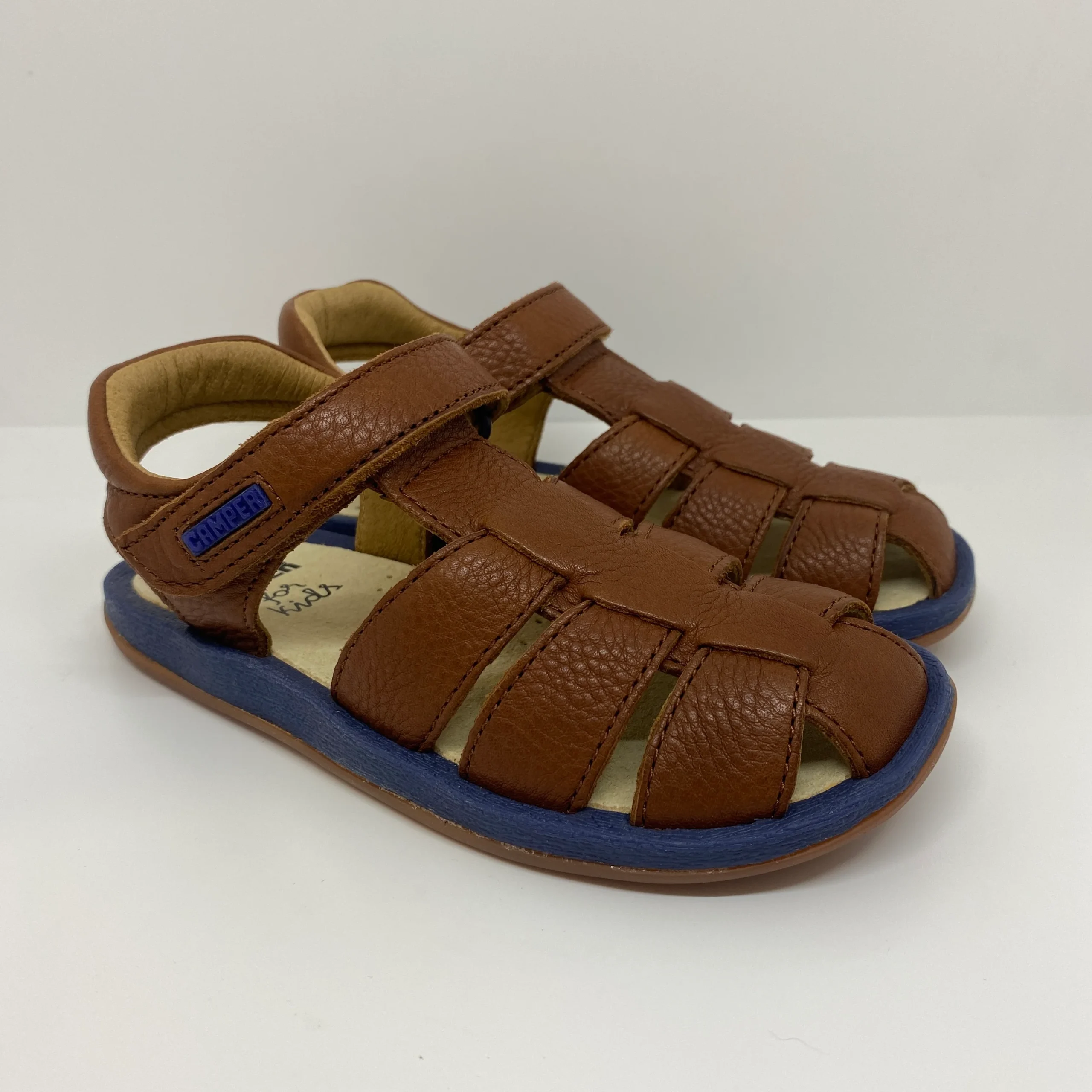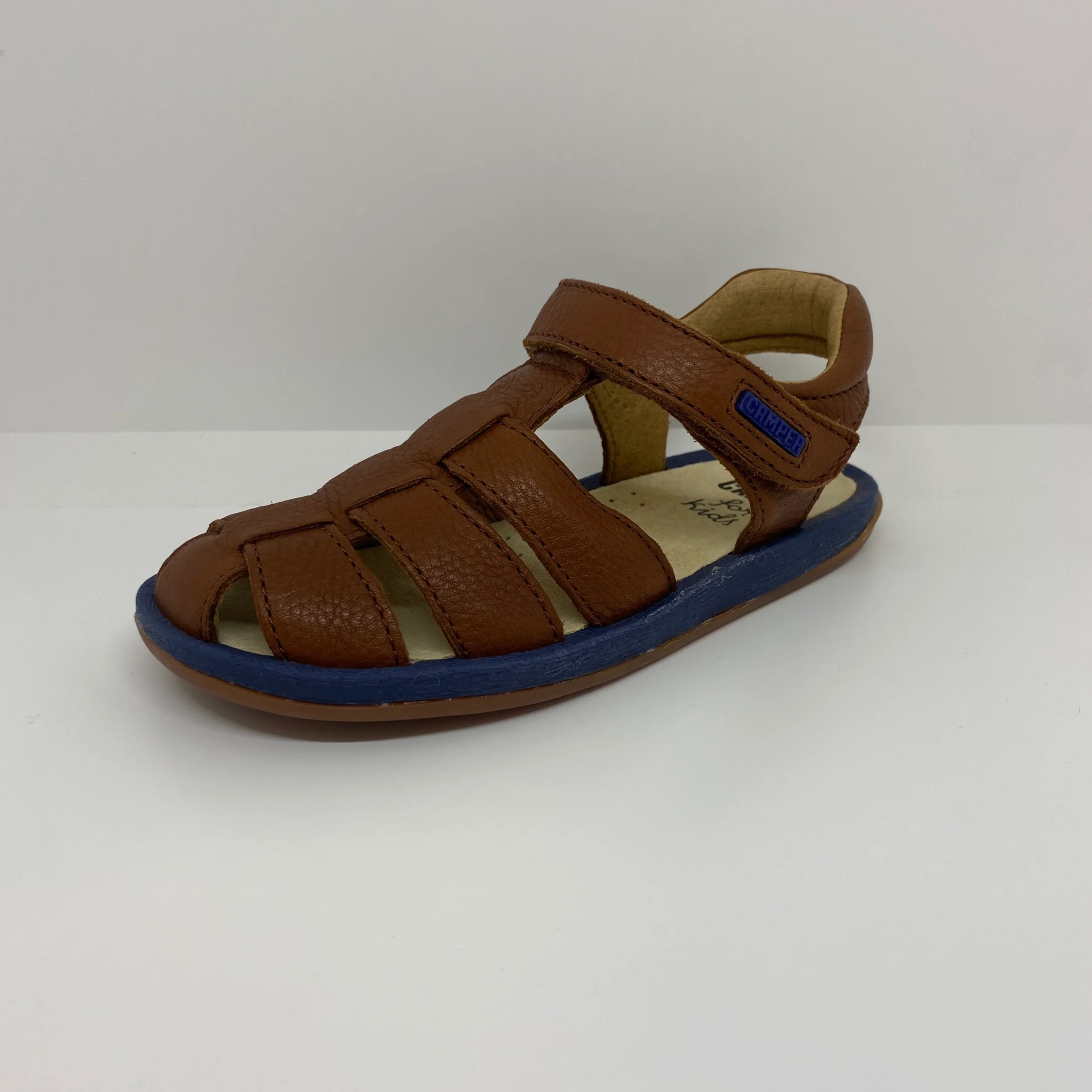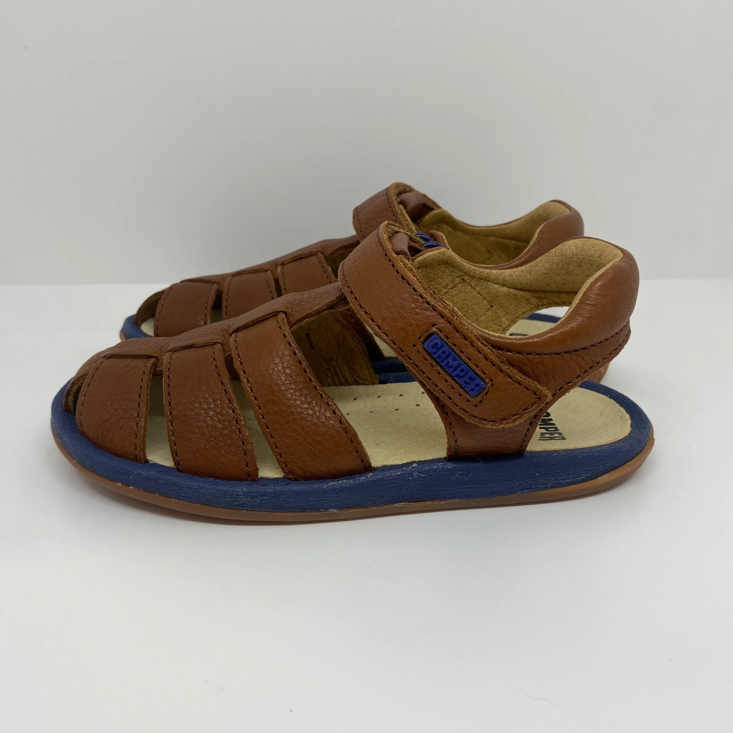 Sandales à bout fermé et brides en T, à fermeture velcro, en cuir pleine fleur marron.