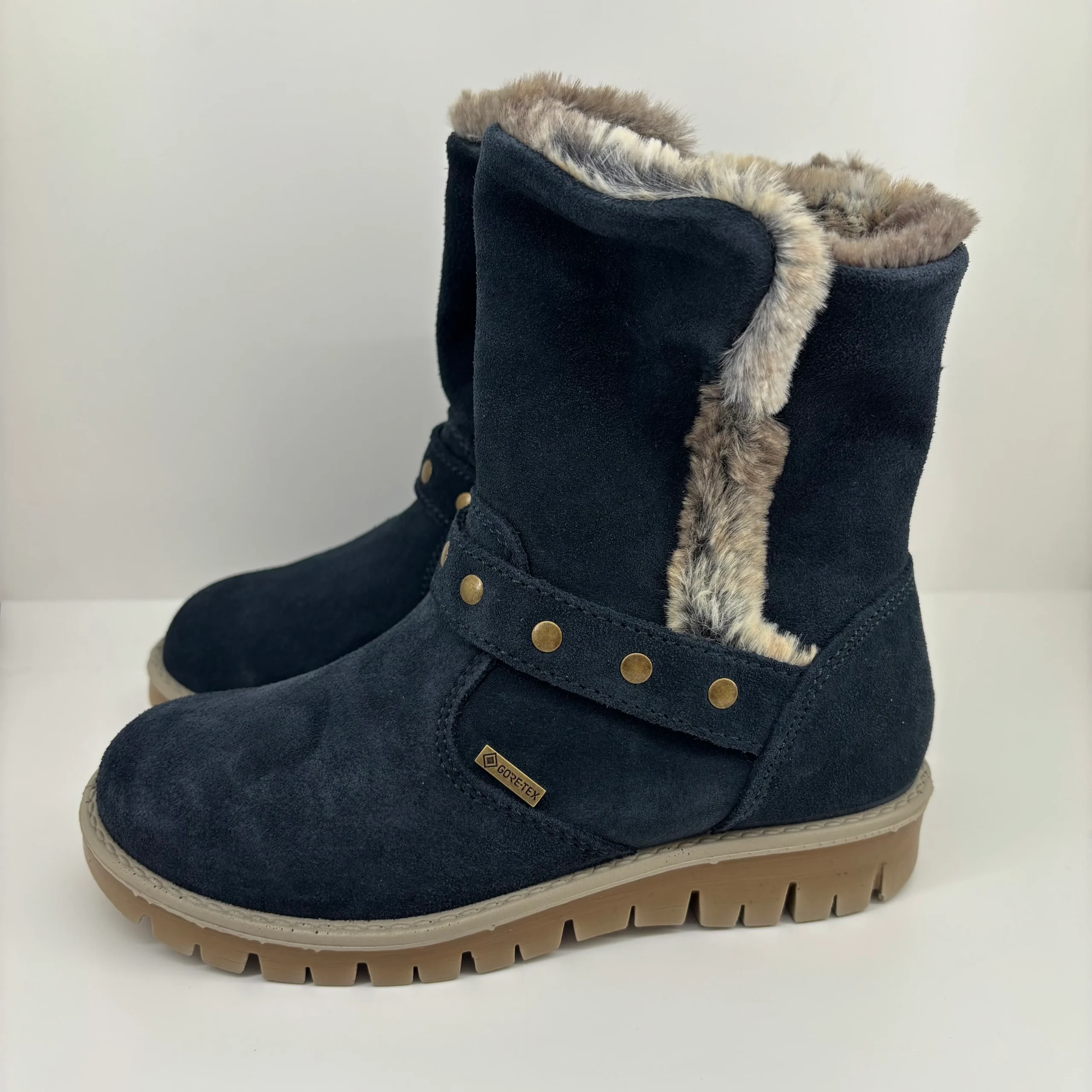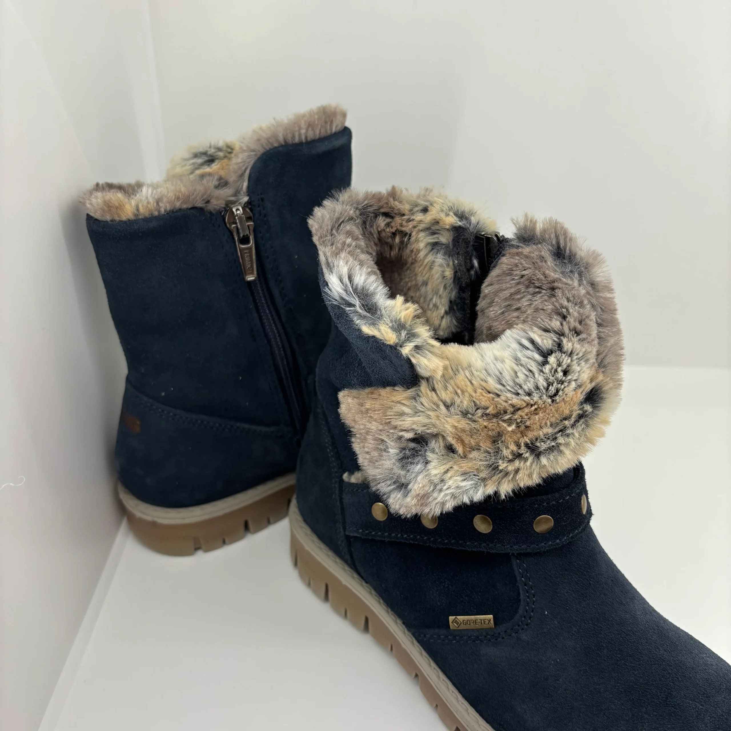 Ces bottes mi-montantes pour enfant allient style raffiné et performance technique pour traverser l’hiver bien au chaud et au sec. Conçues en cuir avec une doublure en laine naturelle, elles assurent confort, isolation thermique et respirabilité grâce à la technologie Gore-Tex. Leur col orné de fausse fourrure et la bande décorée sur le dessus du pied apportent une touche mode discrète et élégante, parfaite pour les sorties comme pour l’école.
