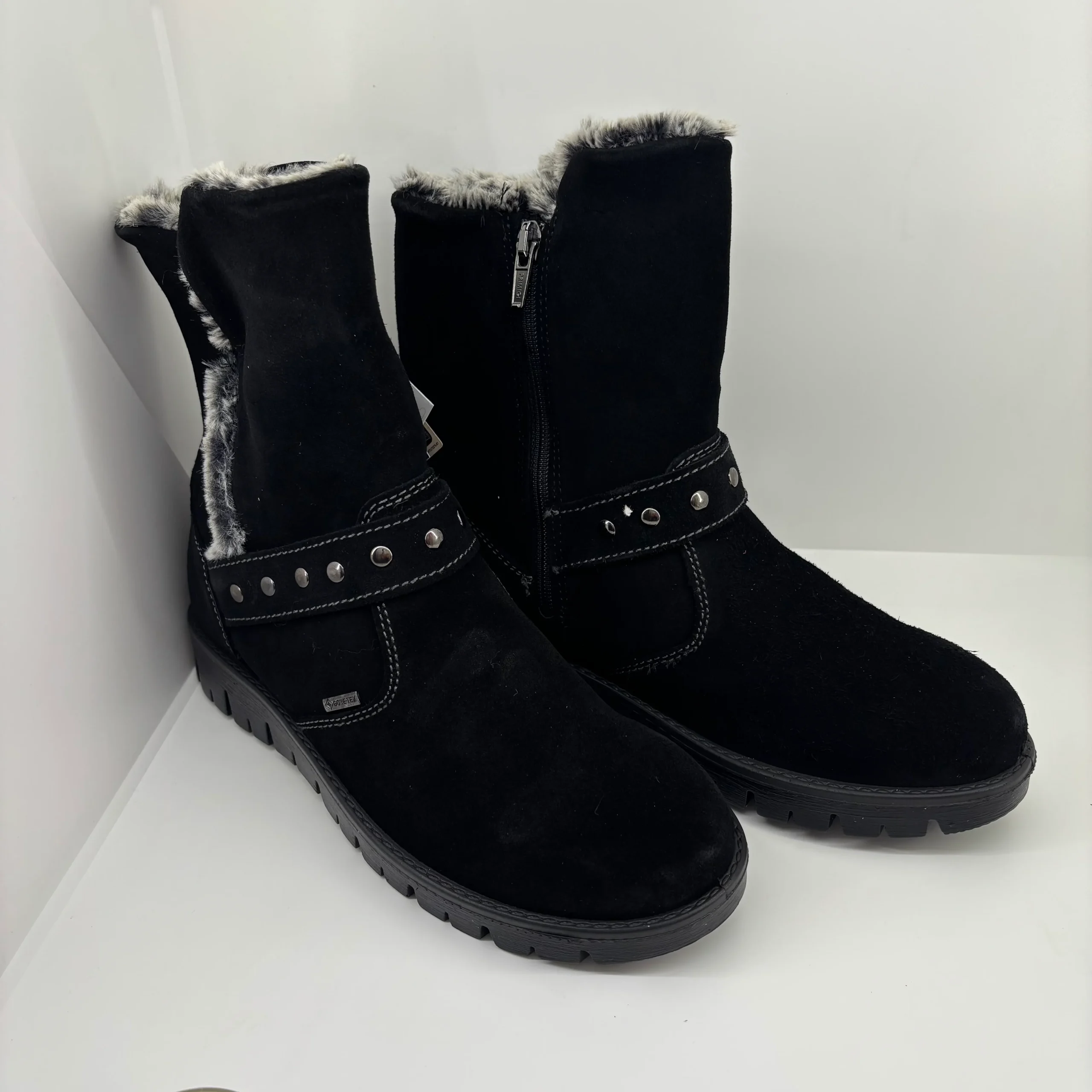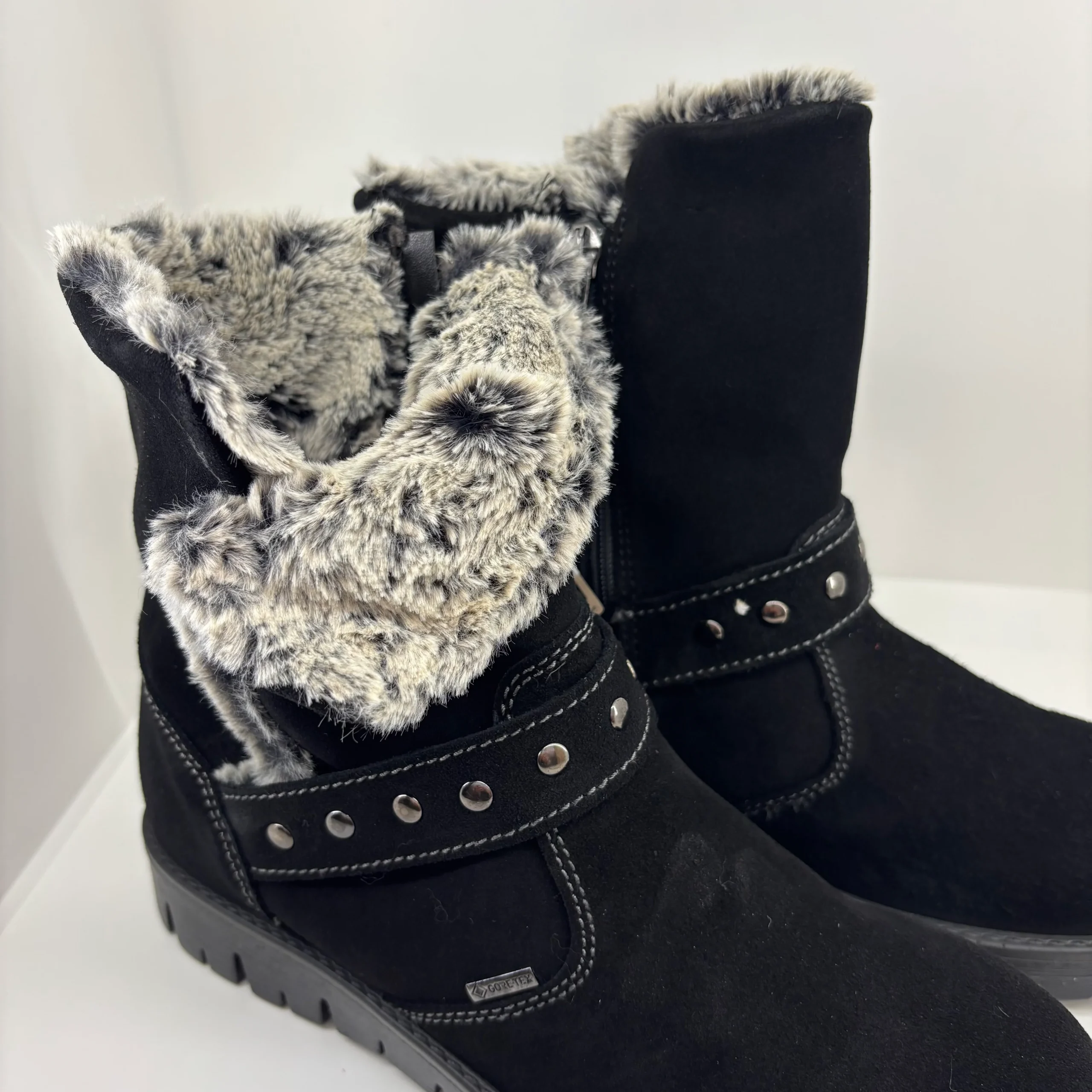Ces bottes mi-montantes pour enfant allient style raffiné et performance technique pour traverser l’hiver bien au chaud et au sec. Conçues en cuir avec une doublure en laine naturelle, elles assurent confort, isolation thermique et respirabilité grâce à la technologie Gore-Tex. Leur col orné de fausse fourrure et la bande décorée sur le dessus du pied apportent une touche mode discrète et élégante, parfaite pour les sorties comme pour l’école.