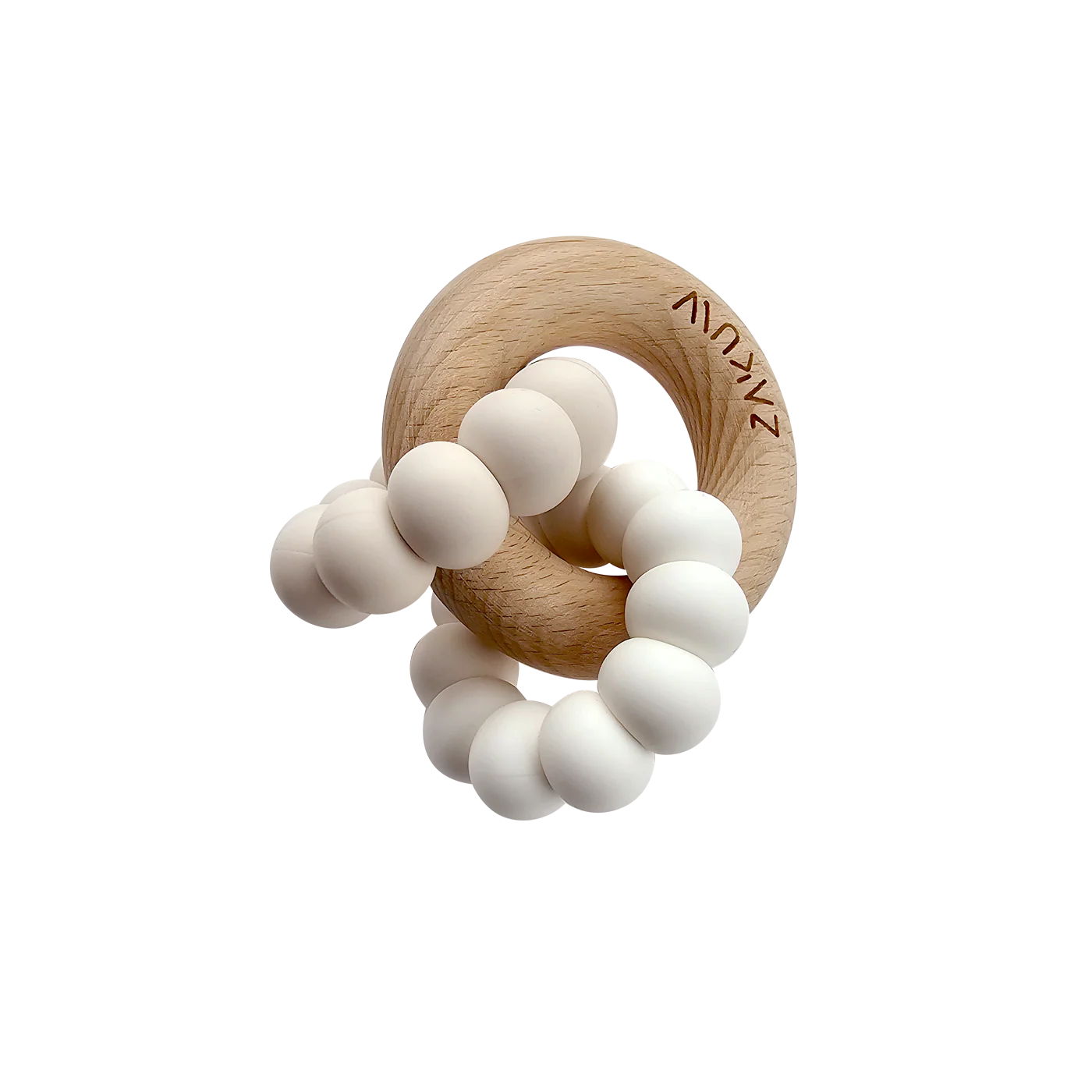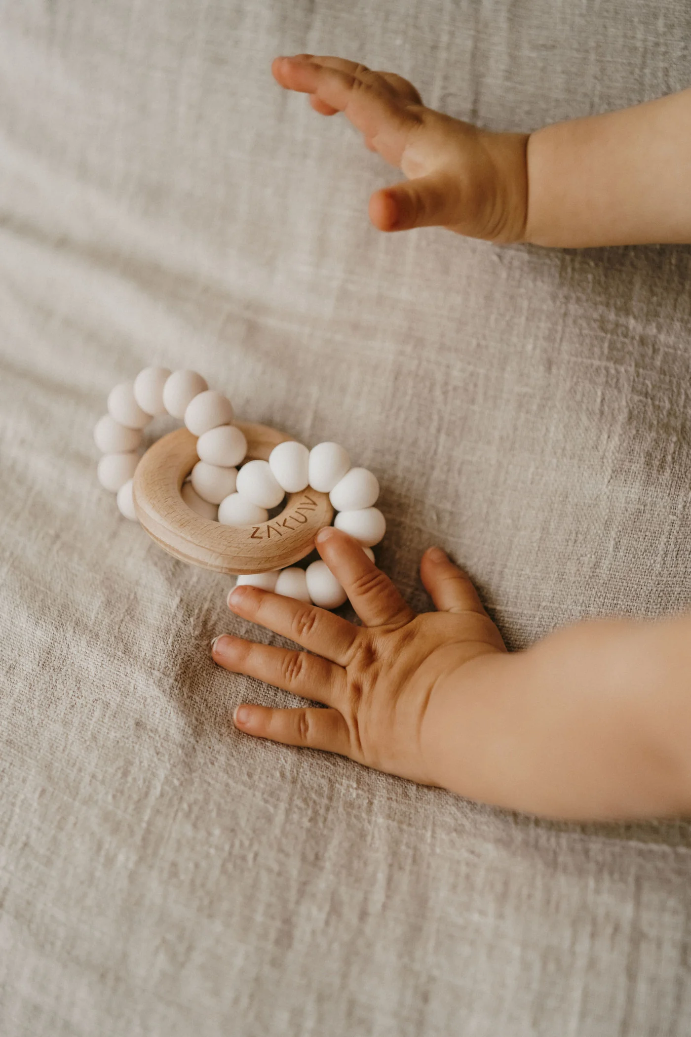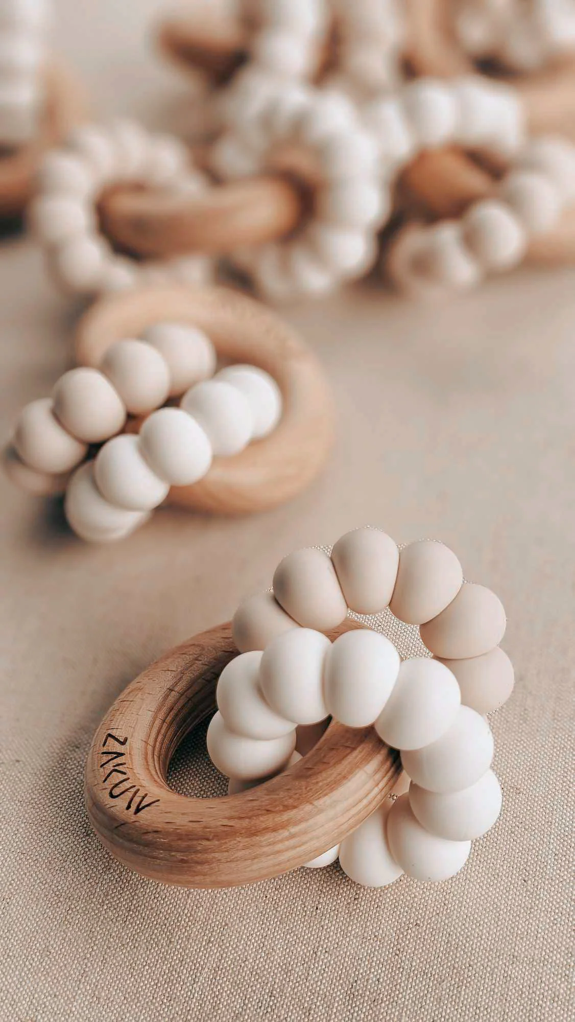 Apaisez les gencives de bébé en douceur avec nos anneaux de dentition en bois et silicone alimentaire.