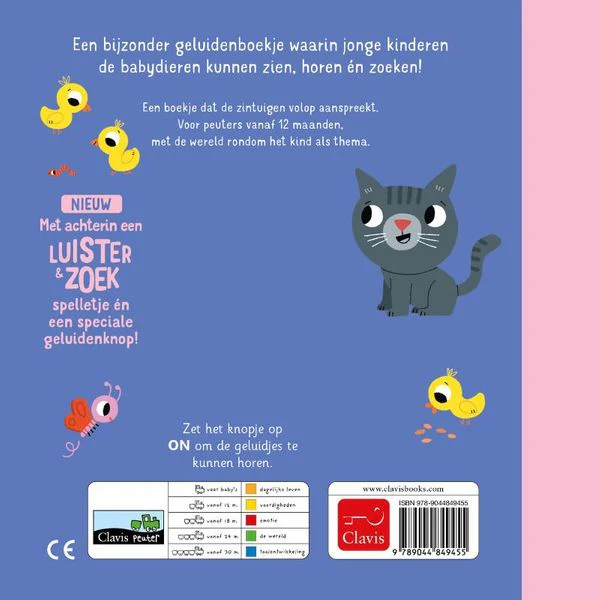 Un livre sonore spécial dans lequel les jeunes enfants peuvent voir, entendre et chercher des bébés animaux ! Un livre qui fait appel à tous les sens. Pour les tout-petits à partir de 12 mois, sur le thème du monde qui entoure l’enfant.