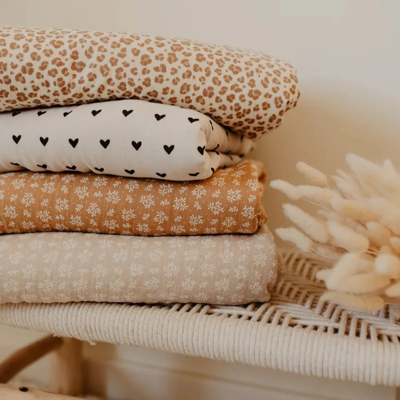 Couverture avec une face en triple gaze de coton au motif Fleurs blanches et une face en moumoute.