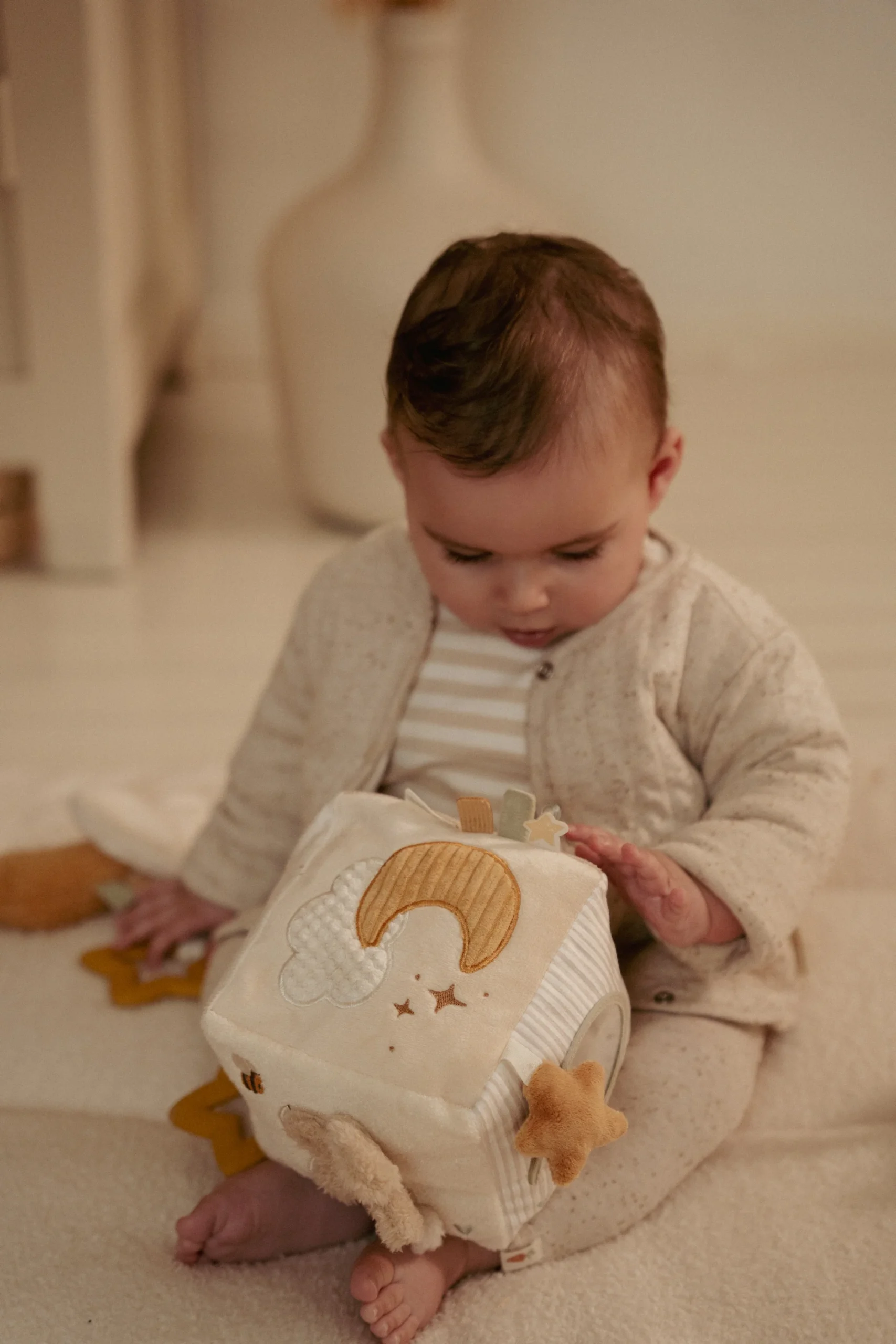 Le Cube d’Activités Newborn Naturals est plein de surprises pour les petits explorateurs ! Chaque côté invite à jouer, avec des tissus doux, des bruits de froissement, des étiquettes ludiques et un petit miroir sûr pour se regarder.