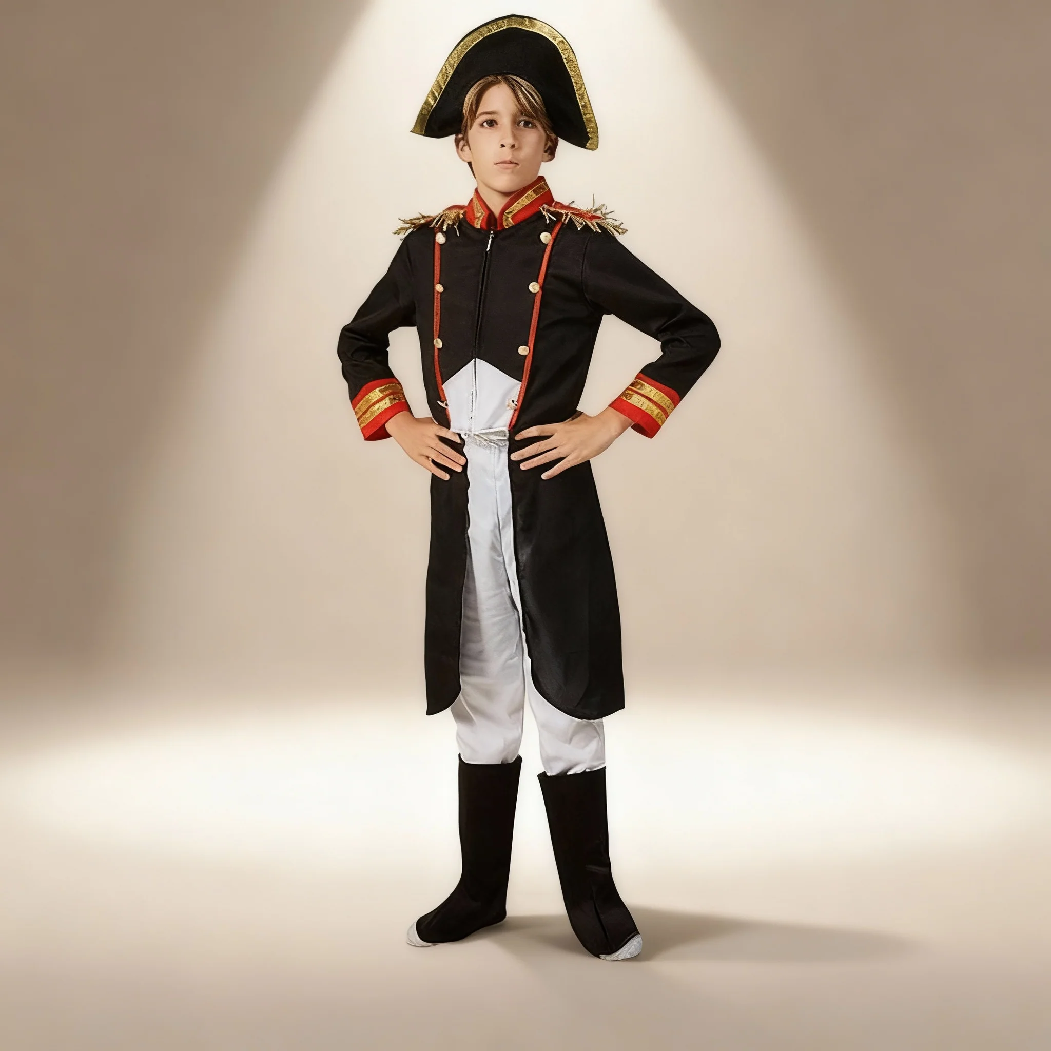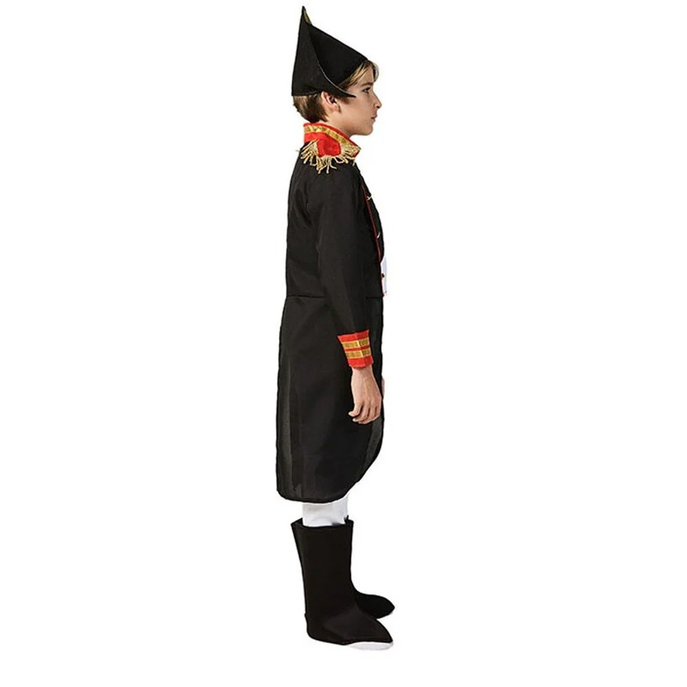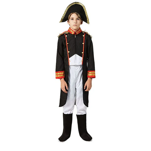 Ce déguisement de pirate pour garçon mise sur un style simple mais raffiné, inspiré des uniformes d’officiers marins d’antan. Le haut noir à la coupe droite est rehaussé par un col et des revers de manches décorés de bandes rouges et dorées, rappelant l’élégance militaire de l’époque. Le pantalon blanc, également droit, descend jusqu’aux chevilles et s’accorde parfaitement avec une paire de bottes noires pour un rendu sobre et réaliste. Pour compléter ce costume, un large chapeau tricorne noir aux contours dorés vient couronner la tenue, offrant à votre enfant l’allure charismatique des plus grands corsaires.