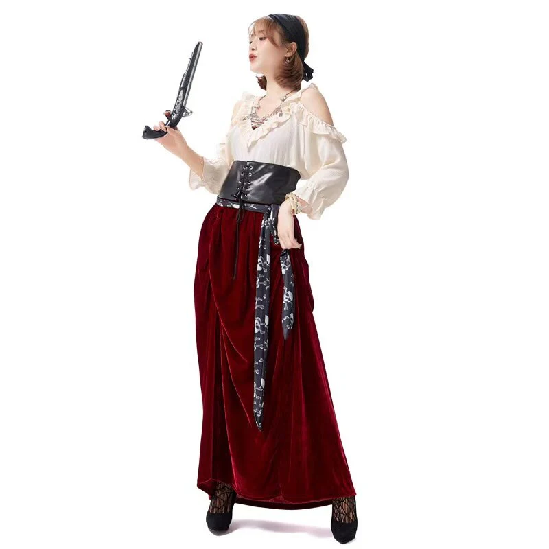 Ce déguisement pirate féminin mêle raffinement et allure théâtrale pour un style inoubliable. La chemise blanche, légère et sensuelle, laisse le torse et les épaules apparents, apportant une touche audacieuse. La taille est parfaitement soulignée par une large ceinture en cuir, façon corset, qui structure la silhouette avec élégance. Sous celle-ci, une longue jupe bordeaux à l’effet velours descend jusqu’aux pieds, offrant un rendu luxueux et fluide, idéal pour incarner une capitaine majestueuse. Un costume parfait pour les soirées déguisées, les carnavals ou les fêtes à thème, alliant confort et prestance.