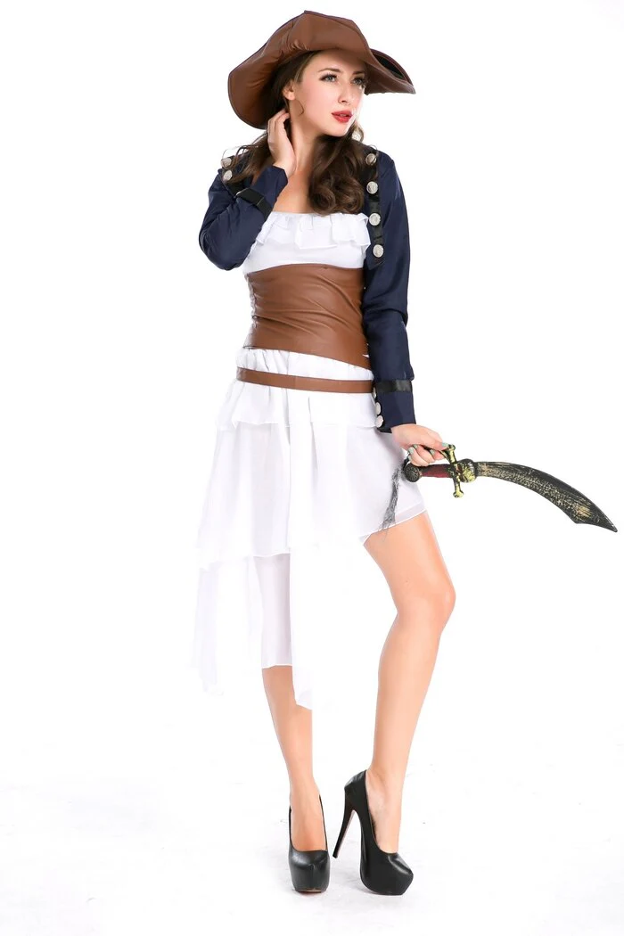 Plongez dans un univers féerique avec ce déguisement pirate inspiré de l’univers des cowboy, mêlant élégance et audace. La robe blanche, cintrée et raffinée, épouse la silhouette depuis le buste jusqu’aux genoux, offrant une allure gracieuse. Elle est sublimée par une veste bleue portée ouverte, qui apporte contraste et caractère à l’ensemble. La taille est soulignée par un large foulard marron noué avec style, rappelant la teinte du chapeau pirate assorti, pour une harmonie parfaite. Ce costume unique allie l’univers enchanteur des contes à l’esprit rebelle de la piraterie, idéal pour carnavals, soirées costumées ou fêtes à thème originales.