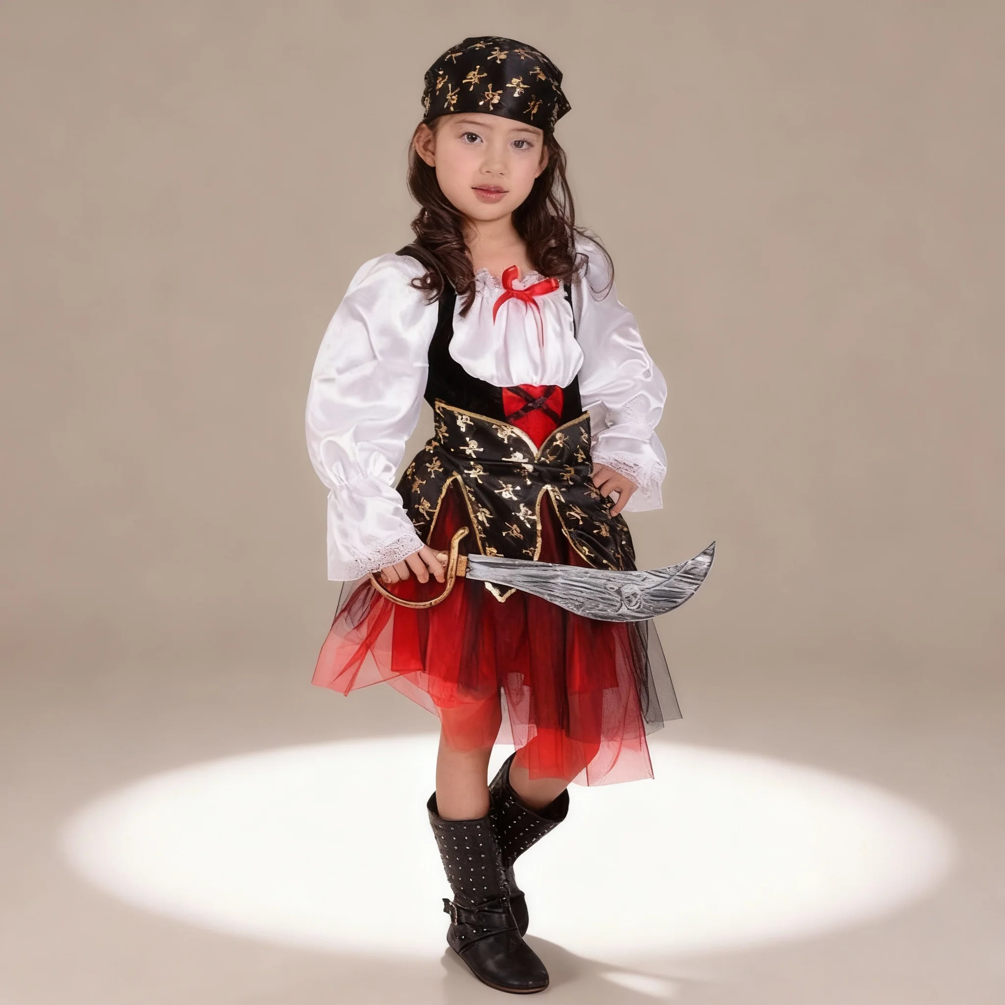 Avec ce déguisement pirate, votre enfant de 10 ans plongera directement dans l’univers des corsaires et des trésors cachés. La tenue s’ouvre sur une chemise blanche ample aux manches évasées, rappelant l’allure authentique des marins d’antan. Par-dessus, une robe en deux étages vient structurer l’ensemble : une première jupette noire décorée de motifs pirates, courte et dynamique, surmontée d’une jupe en flanelle rouge fluide qui descend élégamment jusqu’aux genoux. Un bandana assorti à la jupette habille la tête pour renforcer le style rebelle. Enfin, une paire de bottines noires montant à la cheville complète ce costume plein de caractère.