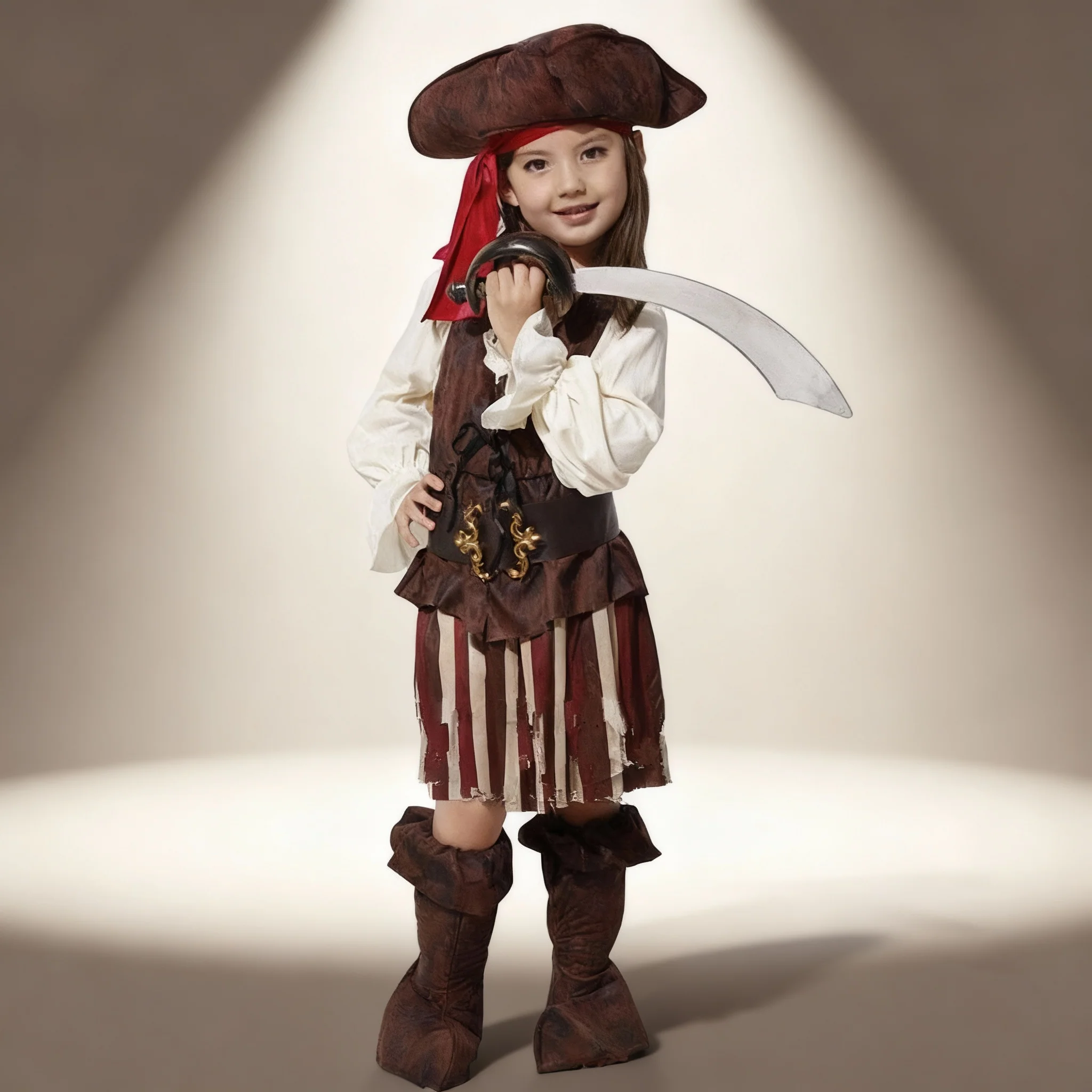 Transformez votre enfant en véritable aventurière des mers avec ce magnifique déguisement pirate spécialement conçu pour fille de 12 ans. L’ensemble débute par une chemise crème à manches longues, légère et confortable, qui se complète d’un gilet sans manches en simili cuir marron, ajusté à la taille par une ceinture assortie ornée d’une large boucle dorée. La jupe évasée, à rayures rouges et marron, apporte dynamisme et authenticité, descendant élégamment jusqu’aux mollets. Une paire de bottes marron vient renforcer le style corsaire. Enfin, le tricorne en cuir vieilli, posé sur un bandana bordeaux retombant sur l’épaule, parachève cette tenue au caractère intrépide.
