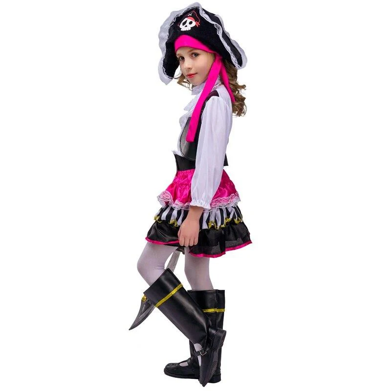 Ce déguisement pirate pour fille de 9 ans combine élégance et esprit d’aventure. La tenue commence par une chemise blanche en flanelle à manches longues, recouverte d’un fin gilet noir qui habille les côtés tout en laissant le devant apparent. La taille est soulignée par une ceinture en tissu rehaussée d’une large boucle dorée, ajoutant une touche authentique. Le bas se compose d’une jupe à trois niveaux descendant jusqu’aux genoux : une partie supérieure rose, suivie d’un pan à rayures noires et blanches, puis d’une finition en dentelle noire fluide. Des bottines noires mi-mollet, décorées d’une bande dorée, viennent compléter le bas. Enfin, un majestueux tricorne noir orné d’un Jolly Roger et de dentelle blanche, posé sur un bandana rose dont un pan tombe sur l’épaule, parachève ce costume raffiné et intrépide.