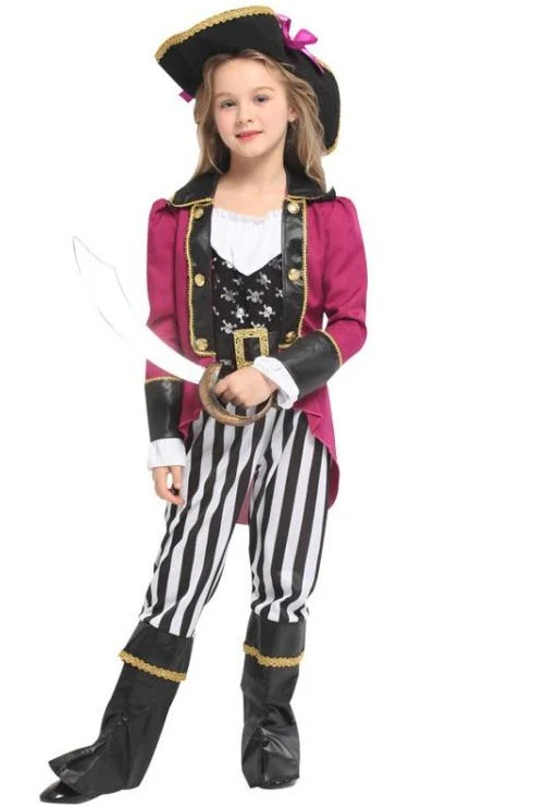 Ce déguisement pirate pour fille incarne l’élégance et l’autorité d’une véritable héritière des mers. La tenue débute par une chemise blanche classique, recouverte d’un gilet noir fermé qui habille entièrement le buste. Par-dessus, une veste bordeaux au style raffiné, avec de larges revers marron aux manches, se porte ouverte et confère une allure majestueuse. Le bas se compose d’un pantalon à rayures verticales noires et blanches, fidèle aux codes pirates traditionnels, associé à une paire de bottes noires ornées d’une fine bande dorée sur le revers. Enfin, un chapeau tricorne aux bordures dorées vient couronner l’ensemble et achever ce costume d’exception.