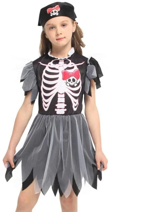 Ce déguisement pirate pour fille spécial Halloween mêle esprit corsaire et atmosphère effrayante. Le buste de la robe est gris et décoré d’un motif squelette blanc façon cage thoracique, avec un Jolly Roger placé à la hauteur du cœur pour accentuer le côté macabre. Les manches s’arrêtent aux épaules avec une coupe évasée, renforçant le style fantomatique. La jupe est conçue en deux niveaux : une couche extérieure en dentelle grise transparente et une couche intérieure noire opaque, le tout se terminant aux genoux dans un effet déchiré. Pour parfaire le look, un bandana noir orné d’un Jolly Roger blanc couvre la tête et complète cette tenue terrifiante.