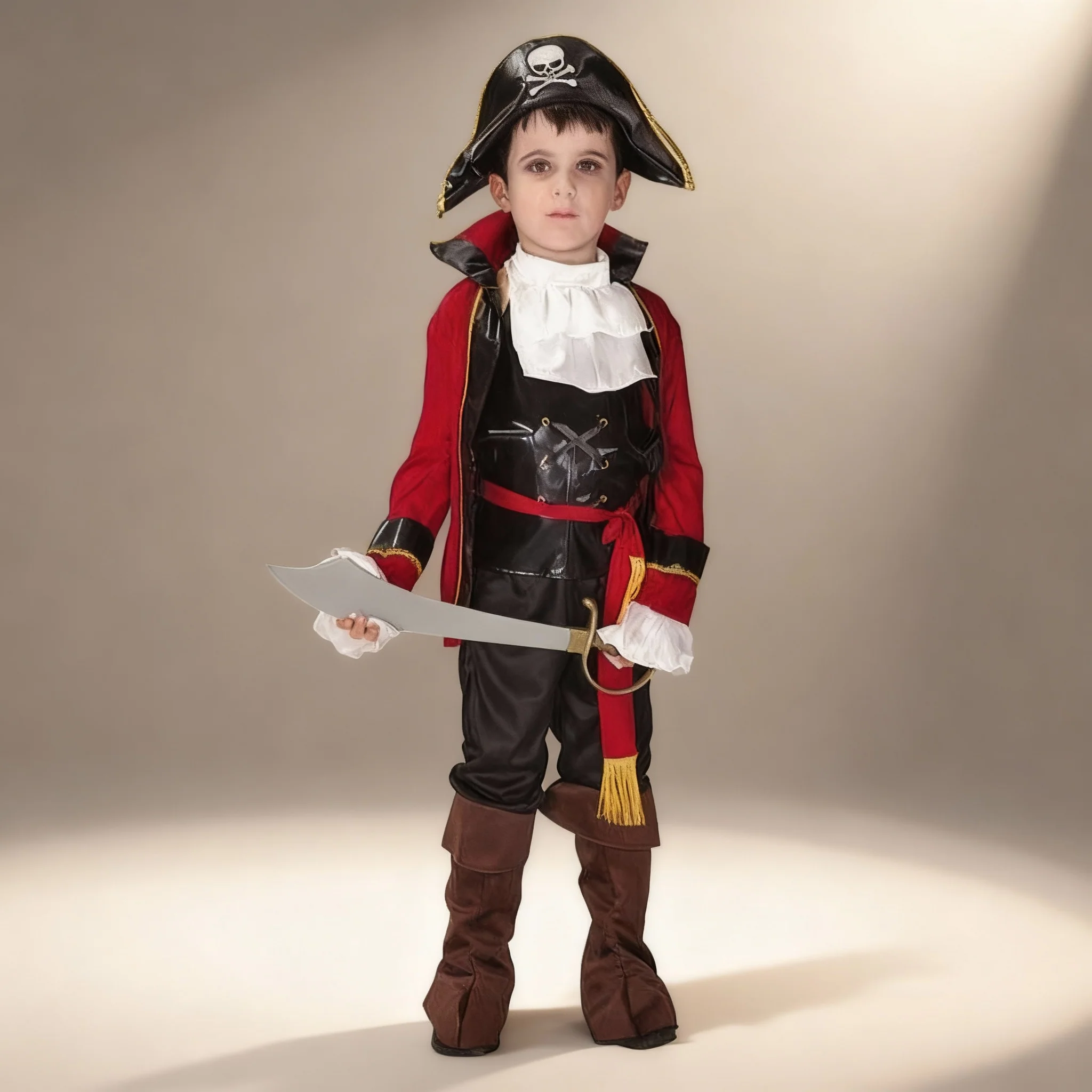 Ce déguisement de pirate haut en détail offre à votre enfant de 9 ans l’allure d’un véritable capitaine des mers. La chemise blanche en flanelle, apparente au niveau du buste et des manches, est recouverte d’une élégante veste écarlate rappelant les uniformes des pirates les plus redoutés. Un corset noir façon cuir, serré par des lanières croisées, structure l’ensemble et met en valeur la silhouette. Une ceinture foulard rouge terminée par une extrémité dorée apporte une touche éclatante et raffinée. Le pantalon noir s’accompagne de solides bottes marron montant à mi-mollet. Enfin, un grand chapeau tricorne noir décoré d’un jolly roger blanc parachève ce costume prestigieux.