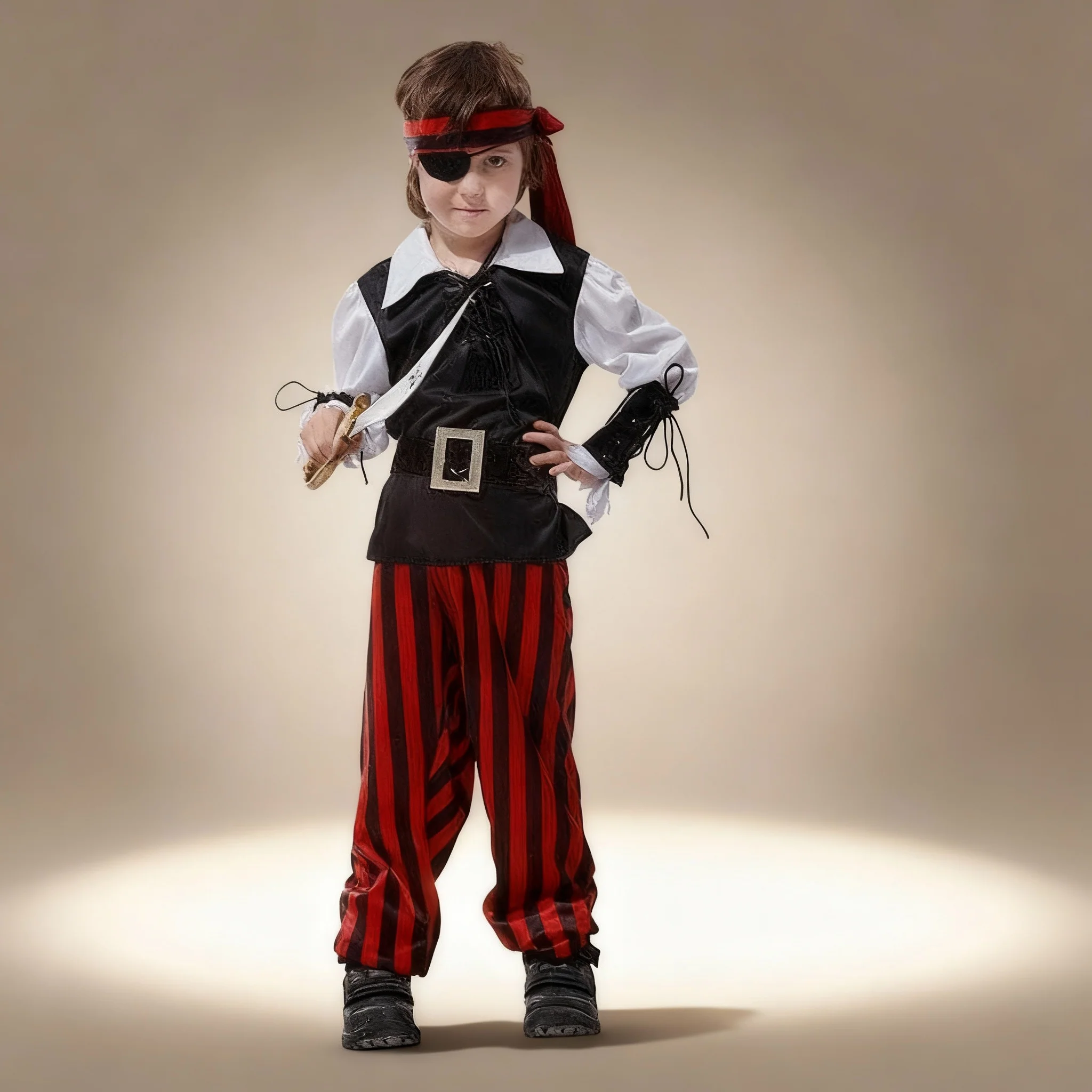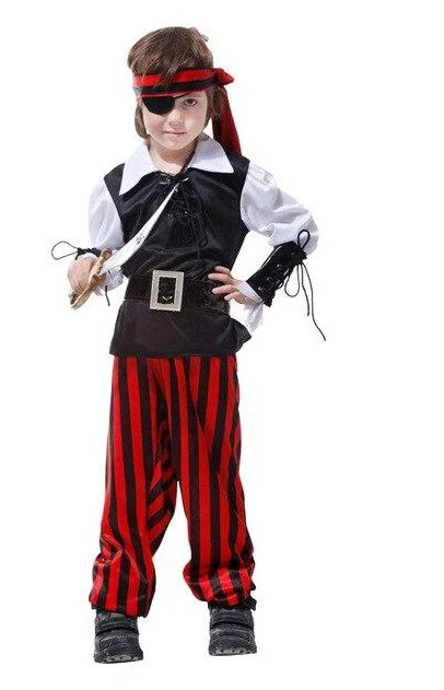 Transformez votre enfant en véritable flibustier avec ce déguisement inspiré des légendes des Caraïbes. La tenue comprend une large chemise blanche à manches longues, recouverte d’un gilet noir sans manches, maintenu à la taille par une ceinture imposante avec une grande boucle métallique. Deux manchettes en simili cuir noir viennent habiller les avant-bras pour renforcer le réalisme. Le pantalon ample à rayures verticales rouges et noires rappelle le style emblématique des pirates et s’accorde parfaitement avec un bandeau assorti à nouer autour du crâne. Pour parfaire ce look d’aventurier intrépide, un cache-œil noir en tissu complète l’ensemble avec authenticité.