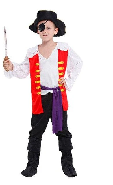 Ce déguisement de pirate pour garçon allie élégance et esprit d’aventure. Il se compose d’une large chemise blanche à col ouvert, aux manches longues et amples terminées par des revers apparents, pour un style authentique. Par-dessus, un léger gilet rouge vif recouvre uniquement les côtés et se noue à la taille grâce à un foulard violet contrastant. Le pantalon noir classique s’accorde parfaitement avec une paire de bottines montant à mi-mollet. Pour compléter la tenue, un chapeau tricorne noir impose sa prestance et s’accompagne d’un cache-œil noir confortable, apportant la touche finale pour transformer chaque enfant en véritable corsaire stylé.