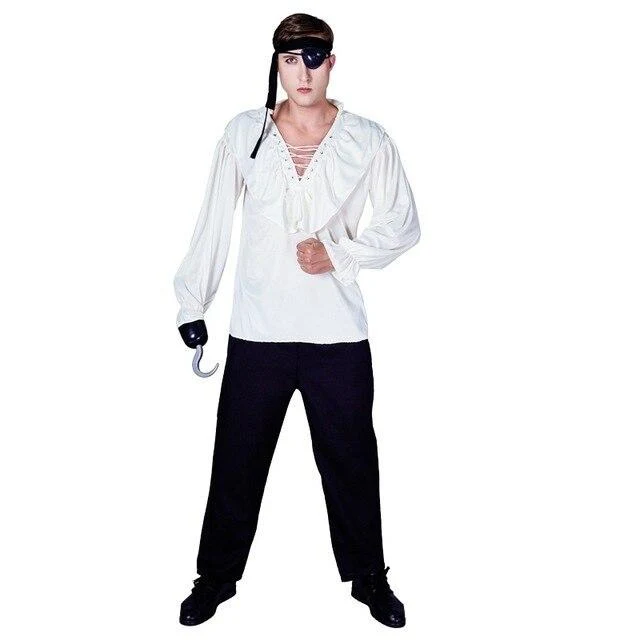 Ce déguisement pirate homme au style de capitaine allie sobriété et élégance. La tenue repose sur une large chemise blanche ample, dotée d’un col en V profond resserré par des lanières assorties. Ses manches amples et évasées se terminent par de délicats revers en dentelle ouverts au niveau des poignets, offrant une allure raffinée et authentique. Le pantalon noir simple mais efficace complète parfaitement cet ensemble léger et confortable. Pour incarner un véritable capitaine des mers, le costume inclut également un crochet pirate en guise de main, un bandeau noir à nouer autour du crâne ainsi qu’un cache-œil pratique et confortable.