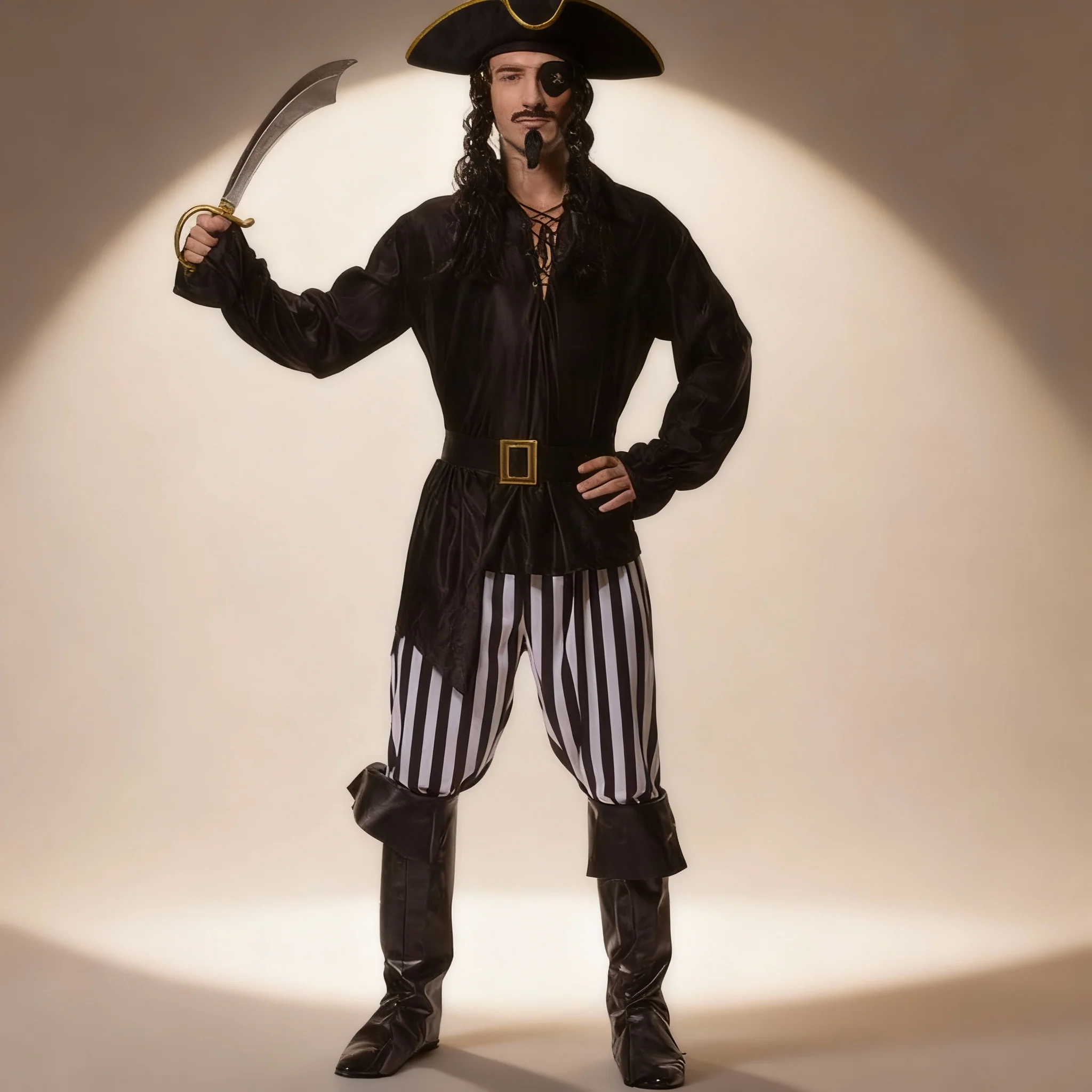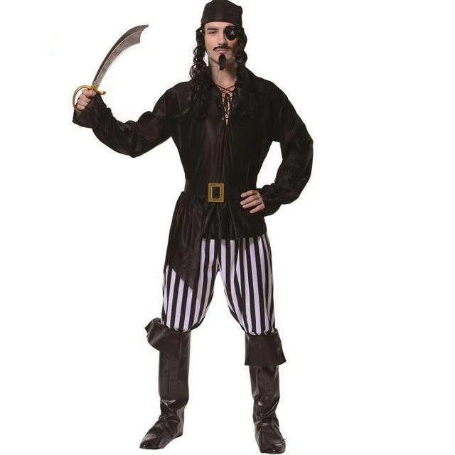 Ce déguisement pirate homme, inspiré de l’univers des célèbres attractions Disney, combine authenticité et fantaisie. La chemise noire cintrée, à col en V resserré par des lanières assorties, apporte une allure soignée et aventurière. Les manches ajustées se terminent par de subtils revers en dentelle ouverts aux poignets, ajoutant une touche théâtrale. Le pantalon ample, orné de bandes verticales noires et blanches, renforce l’esprit classique des pirates. De hautes bottes en cuir marron foncé, montant jusqu’aux genoux, viennent compléter la silhouette avec prestance. Enfin, un bandana noir couvrant toute la tête et un cache-œil décoré d’un jolly roger blanc parachèvent ce costume digne des flibustiers légendaires.