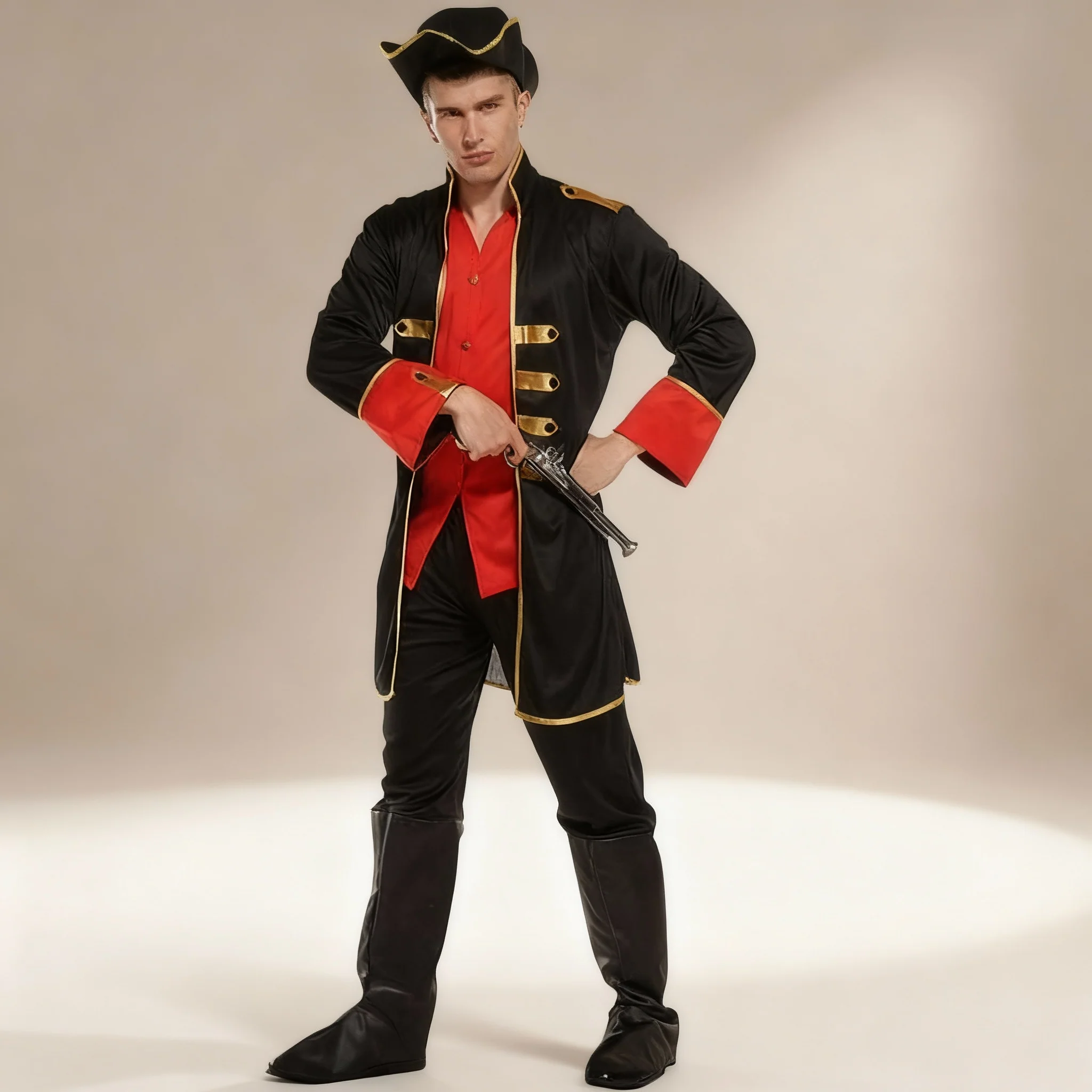 Ce déguisement pirate pour homme associe puissance et élégance avec un contraste saisissant. La chemise rouge flamboyante apporte une touche audacieuse et énergique, mise en valeur par une imposante veste noire opaque aux revers dorés, portée ouverte pour un style majestueux. Le pantalon noir en velours, souple et raffiné, s’accorde parfaitement avec les hautes bottes montant jusqu’aux genoux, renforçant la prestance de l’ensemble. Enfin, un tricorne noir élégant, bordé de finitions dorées, vient coiffer ce costume d’exception. Idéal pour les soirées costumées, carnavals ou spectacles, ce déguisement incarne le pirate charismatique et redouté des mers.