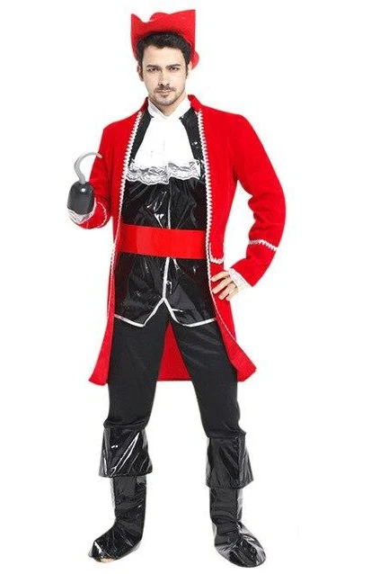 Avec ce déguisement pirate stylé, incarnez un capitaine audacieux au charisme incontestable. La tenue se compose d’une chemise blanche sobre et élégante, mise en valeur par un gilet noir ajusté. L’élément central reste la majestueuse veste rouge, longue et ouverte, aux manches raffinées terminées par des revers blancs qui soulignent son allure noble. Le pantalon noir complète l’ensemble avec sobriété, équilibrant la puissance des couleurs. Pour parfaire ce costume d’inspiration historique, un large chapeau rouge rappelant ceux de la marine britannique antique apporte une touche d’autorité et d’authenticité. Un déguisement parfait pour soirées, spectacles et fêtes costumées.