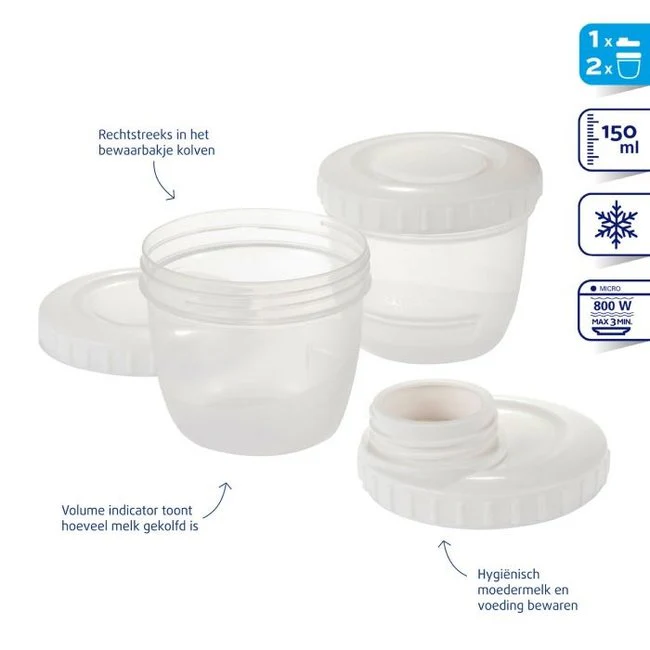 L’indicateur de taille montre clairement la quantité de lait maternel que vous avez tiré. Le récipient peut contenir jusqu’à 150 ml de lait maternel. Le couvercle à vis est étanche, a une bonne prise en main et peut être écrit au crayon. Convient pour une utilisation à long terme et peut être lavé au lave-vaisselle. Spécialement conçu pour le tire-lait primé Difrax.