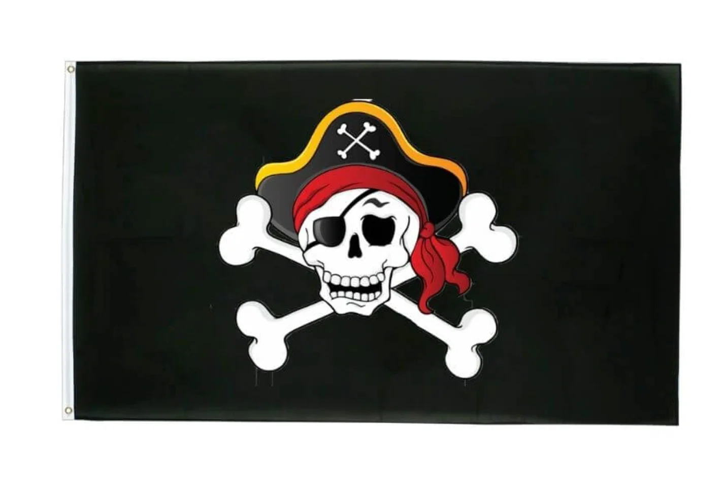 Apportez une touche ludique avec le Drapeau Pirate Banderole : un Jolly Roger joyeux au bandana rouge, tricorne et cache-œil, parfait pour fêtes, chambres d’enfants et déco pirate amusante.