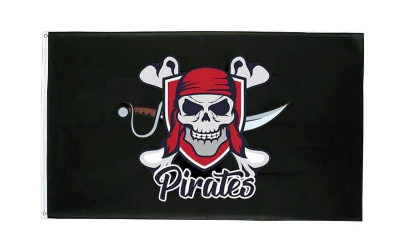 Transformez une cabane en repaire de corsaires avec ce Drapeau Pirate : un Jolly Roger au bandana rouge et sabre, orné de l’inscription « Pirates », parfait pour éveiller l’imagination des jeunes aventuriers.