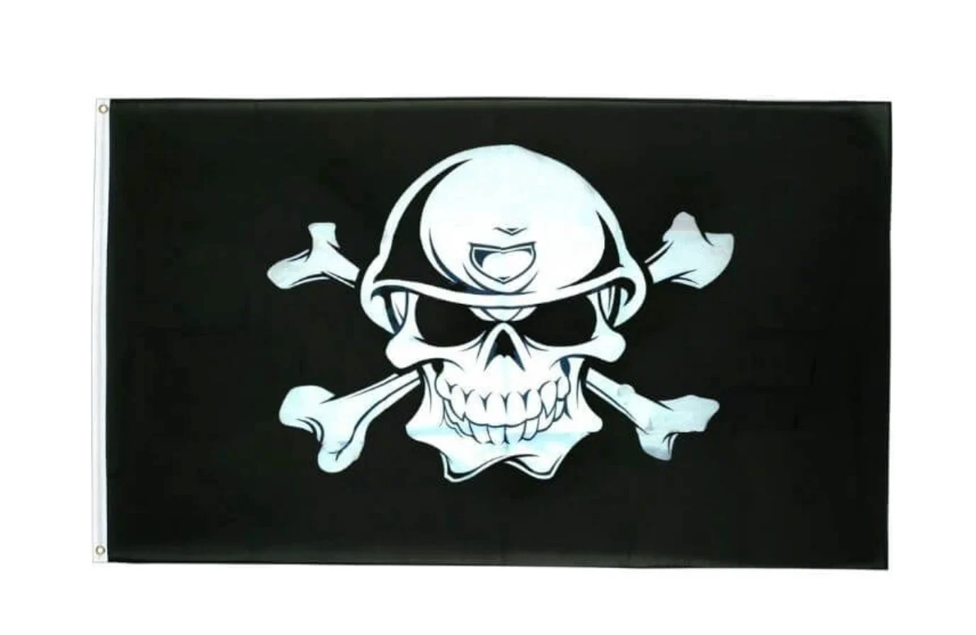 Impressionnez avec le Drapeau Pirate Géant : une immense tête de mort au casque militaire et tibias croisés, symbole moderne de puissance et d’audace, parfait pour une déco pirate spectaculaire.