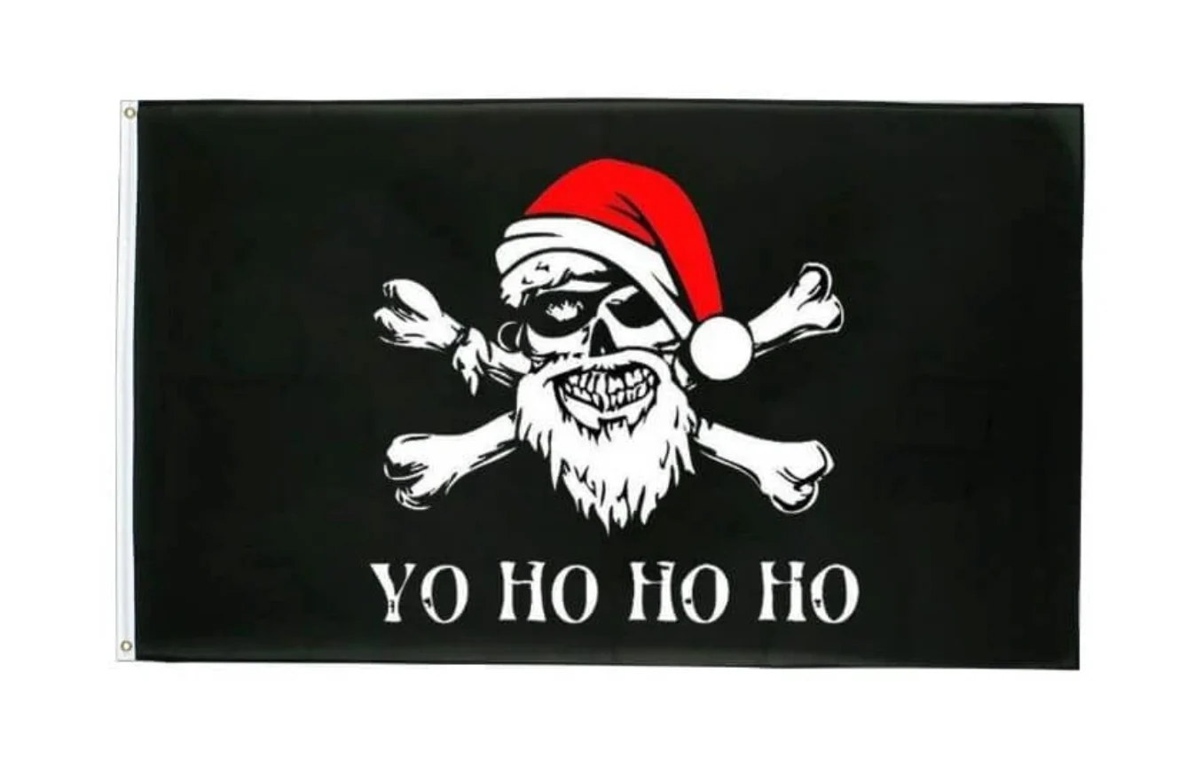 Célébrez les fêtes autrement avec ce Drapeau Pirate : un Jolly Roger façon Père Noël au bonnet rouge, barbe blanche et cache-œil, parfait pour une déco festive et audacieuse.