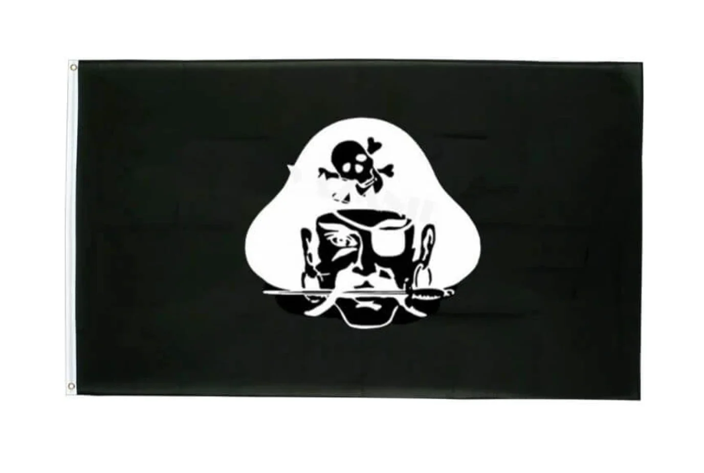 Affirmez votre passion avec ce Drapeau Pirate : un design épuré au capitaine tricorne, cache-œil et poignard entre les dents, idéal pour une déco pirate percutante et authentique.