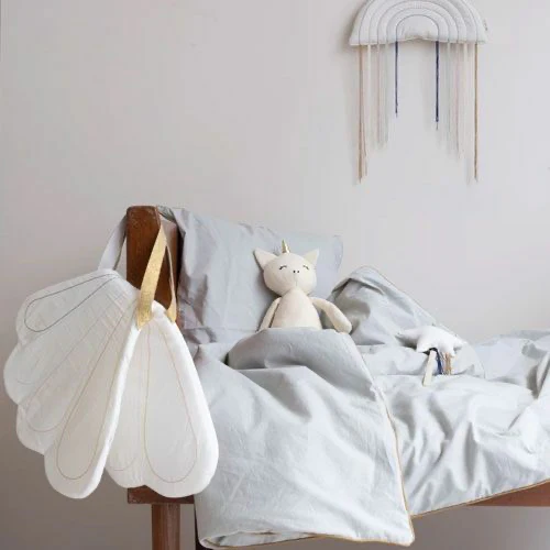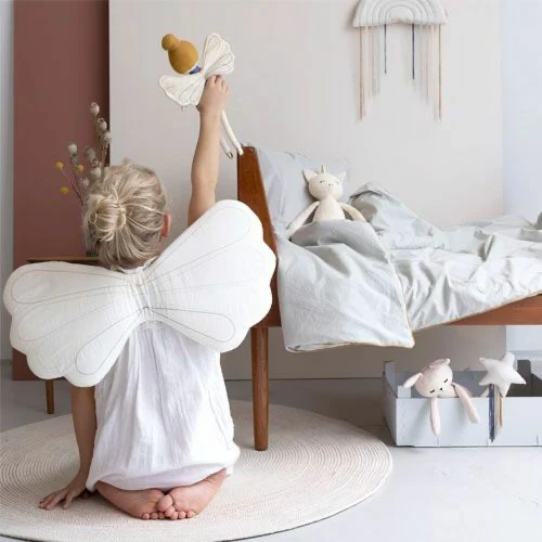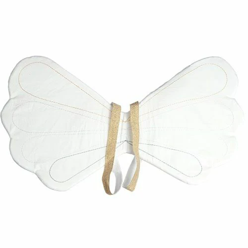 Les ailes sont fabriquées à 100 % en coton biologique certifié GOTS et sont rembourrées de mousse pour plus de confort. Les élastiques dorés permettent de les enfiler facilement sur les bras de votre enfant. L’envergure des ailes est de 55 cm, ce qui les rend parfaites pour les petits enfants.