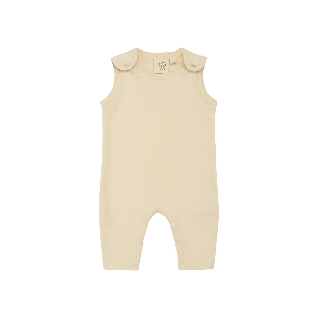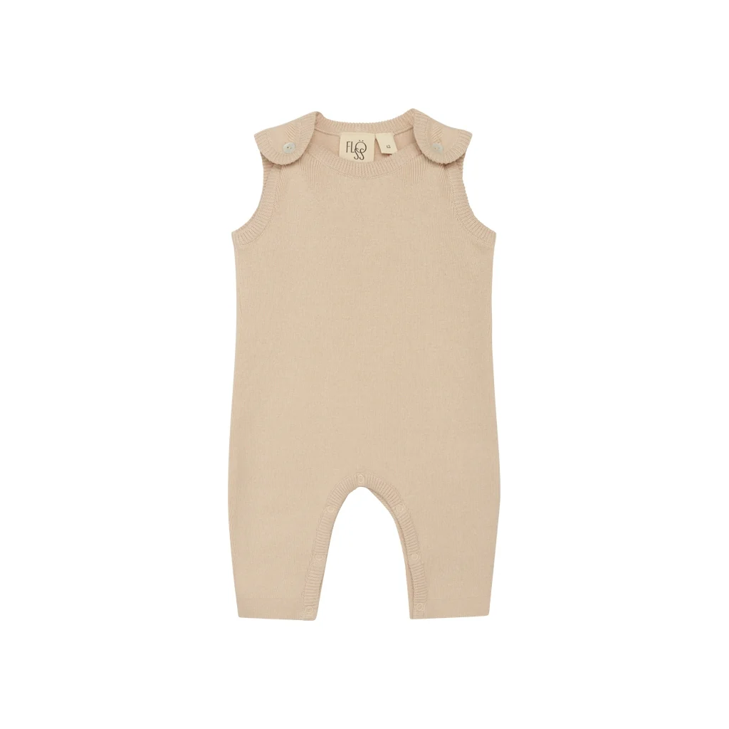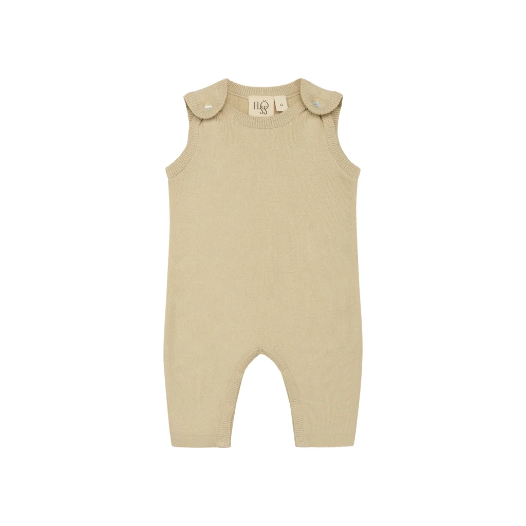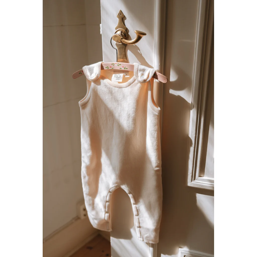 La salopette Kaya est tricotée en douceur, en coton biologique. Sans manches, elle se ferme à l’aide de boutons de perles et de boutons-pression pour faciliter l’habillage.