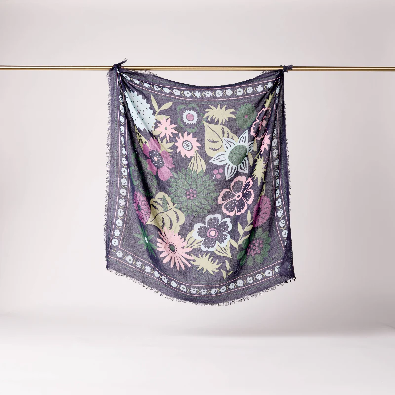 Le foulard Winter Bloom bleu orage, une version revisitée de notre design iconique. Confectionné dans un doux mélange de laine (80%) et de soie (20%), il tient chaud en toute légèreté.
