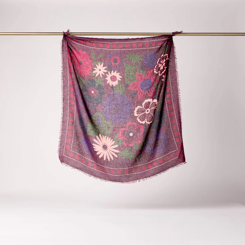 Le foulard Winter Bloom figue, une version revisitée de notre design iconique. Confectionné dans un doux mélange de laine (80%) et de soie (20%), il offre chaleur et légèreté à la fois.