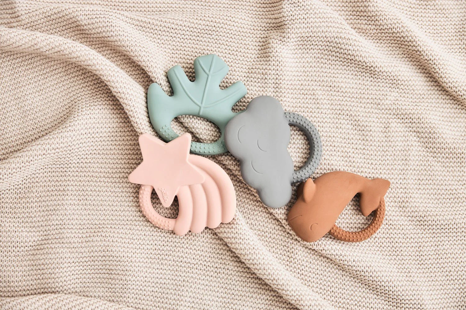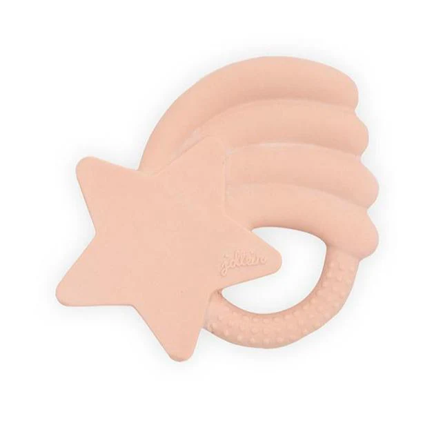 Mignon anneau de dentition en caoutchouc de Jollein. L’anneau de dentition est composé à 100 % de caoutchouc naturel (latex) et est disponible en étoile rose, baleine caramel, nuage gris et feuille verte. L’anneau de dentition peut être utilisé à partir de 0 mois.