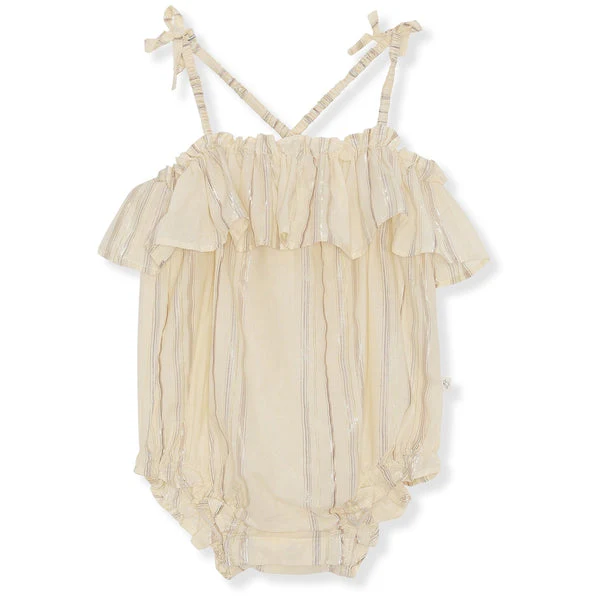 Jolie petite grenouillère FIJI de Konges Slojd avec des froufrous et des bretelles spaghetti, parfaite pour les chaudes journées de printemps ou d’été. La grenouillère est munie de boutons pour faciliter le changement de couche. Caractéristiques Matière : 100% coton biologique Couleur : Champagne/multi lurex Lavable à 30 degrés C