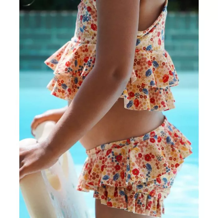 Bikini à volants, bretelles spaghetti et imprimé floral. Les maillots de bain sont fabriqués à partir de bouteilles en plastique recyclées. Tableau des tailles 2 ans : 92 cm 3 ans : 98 cm 4 ans : 104 cm Caractéristiques Fabriqué en polyester recyclé et élasthanne Rouge floral