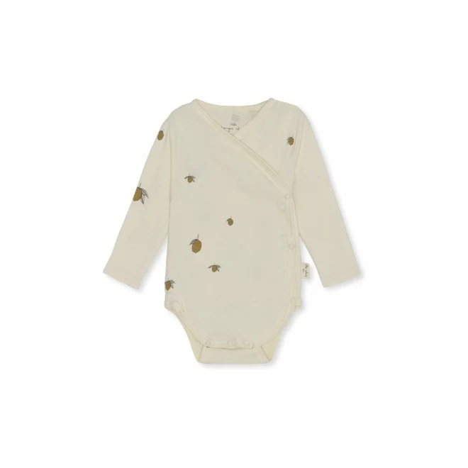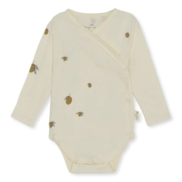 Magnifique grenouillère avec un joli imprimé de citrons de Konges Slojd. Elle est fabriquée en jersey très doux de coton 100 % biologique, parfait pour la peau sensible des bébés.