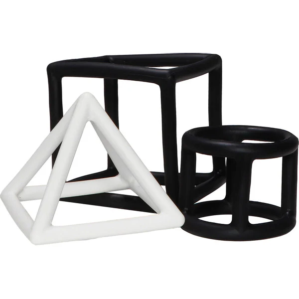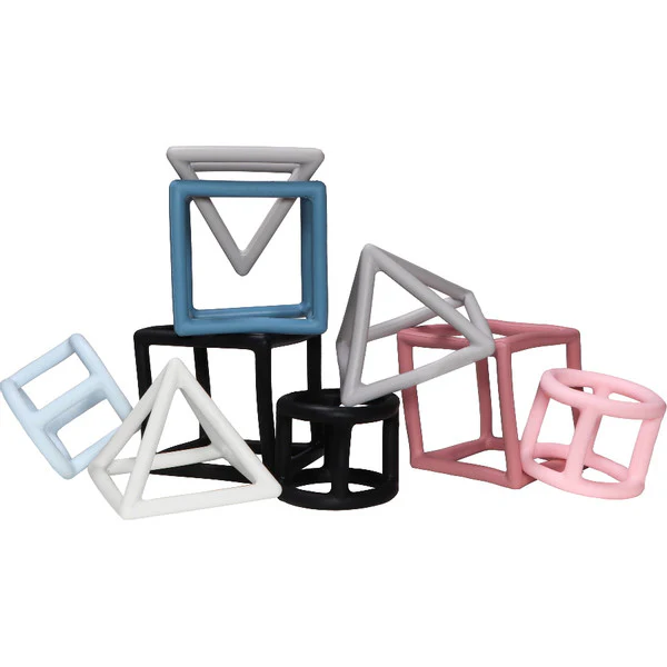 Chaque ensemble contient trois formes différentes – une pyramide, un cube et un cylindre – qui non seulement s’emboîtent, mais sont également idéales pour l’empilage. Grâce à l’utilisation de silicone de haute qualité, ces anneaux de dentition peuvent être mis en bouche en toute sécurité par votre enfant.