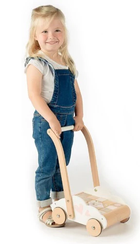 Ce chariot à blocs en bois a été fabriqué à partir de bois de hêtre de qualité certifié FSC. Le chariot et les blocs sont une combinaison de bois naturel et de superbes teintes douces de bleu et de rose appliquées à l’aide d’une peinture à base d’eau adaptée aux enfants.