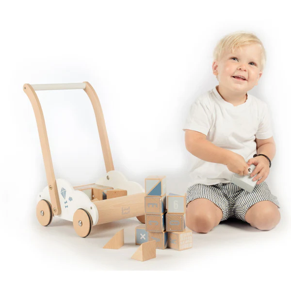 La base en forme de nuage est solide et équipée de roues en bois avec des inserts en caoutchouc pour que votre enfant puisse marcher en douceur et en toute stabilité sur n’importe quelle surface. Le chariot de blocs contient 20 blocs imprimés avec des lettres, des chiffres, des signes mathématiques, des symboles et un bloc avec une belle horloge. Tout s’insère parfaitement dans le chariot idéal pour transformer le moment de rangement en une aventure ludique et éducative.