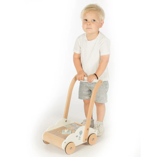 1, 2, 3… GO ! Avec cette magnifique poussette à blocs, les petits sortent avec le style Label Label et emportent leurs blocs préférés partout où ils vont.