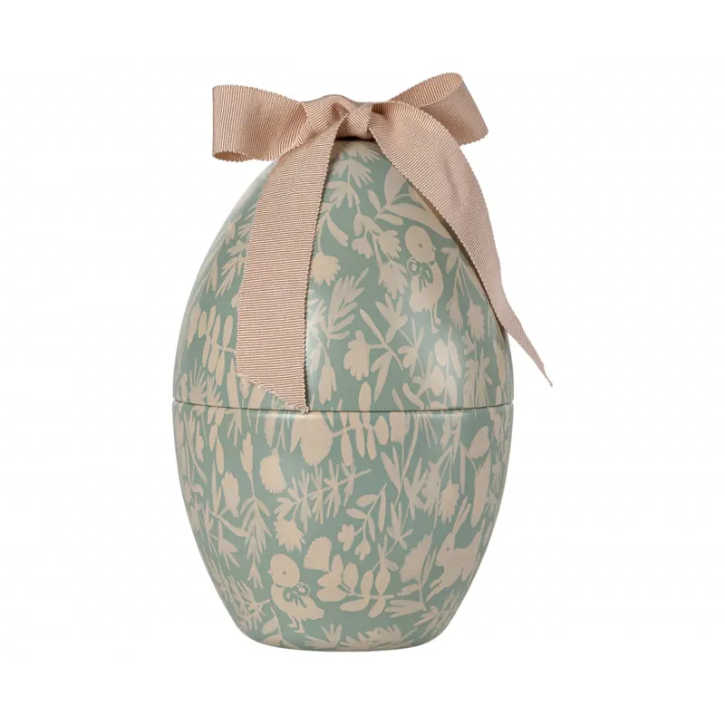 un magnifique œuf en métal et recouvert d’un gros nœud doux sur le dessus – un cadeau parfait pour les petits.