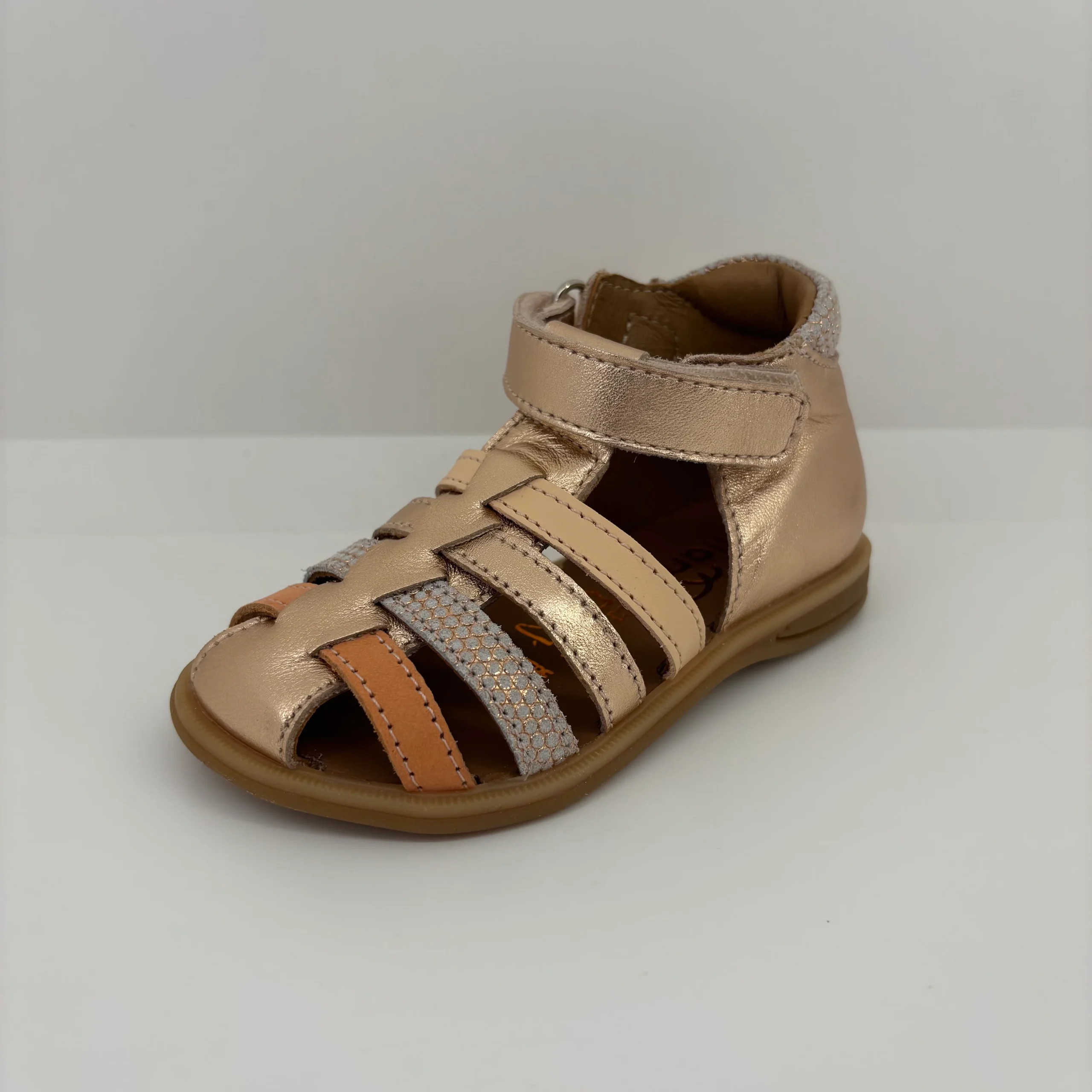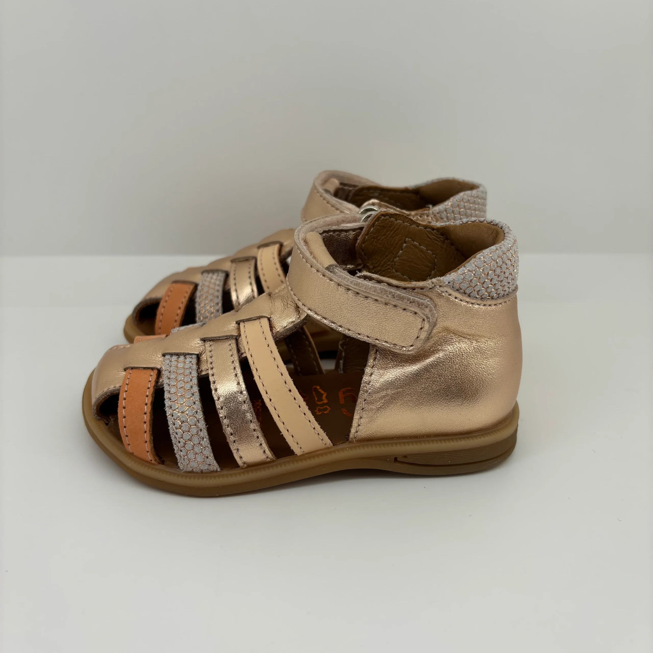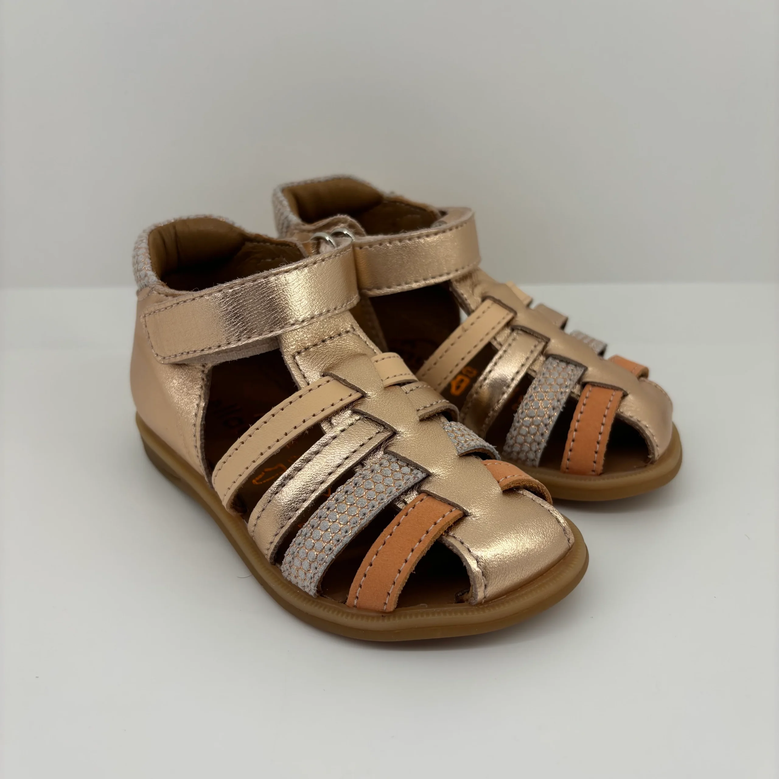 Ces sandales à bout fermé Bellamy, aux tons dorés et pastel, sont pensées pour accompagner les premiers pas de bébé avec douceur, élégance et confort. À la fois ultra souples, protectrices et respirantes, elles sont idéales pour les beaux jours, et s’adaptent parfaitement aux petits pieds des filles en quête de style et de liberté.