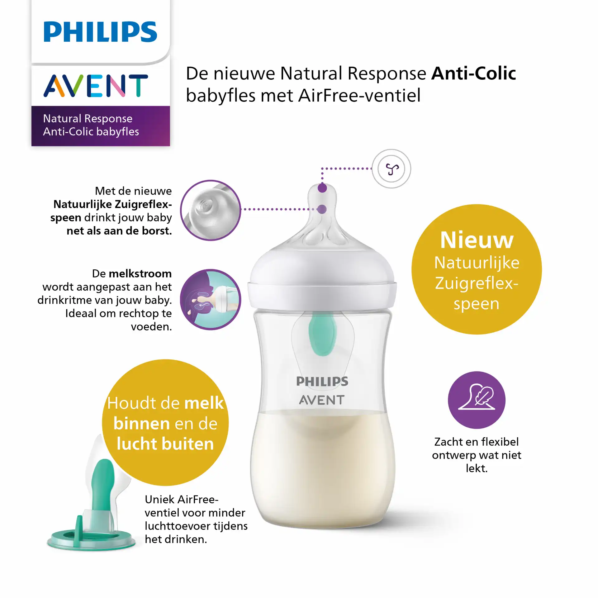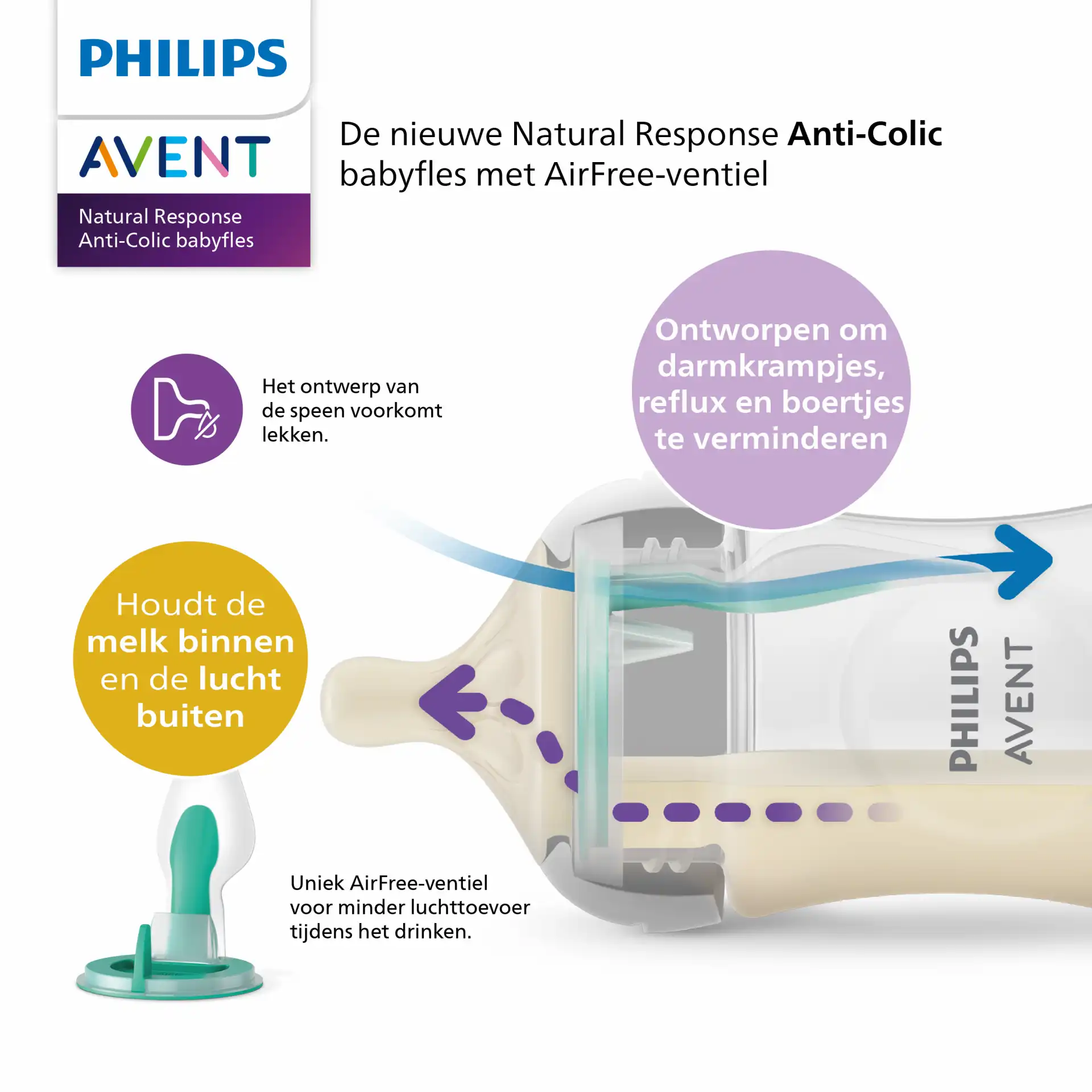 Une alimentation douce et confortable. La tétine Natural Sucking Reflex suit le rythme unique de succion, de déglutition et de respiration de votre bébé. La valve AirFree est conçue pour empêcher l’air de pénétrer dans le ventre de l’enfant, afin d’éviter les crampes, les gaz et le stress.