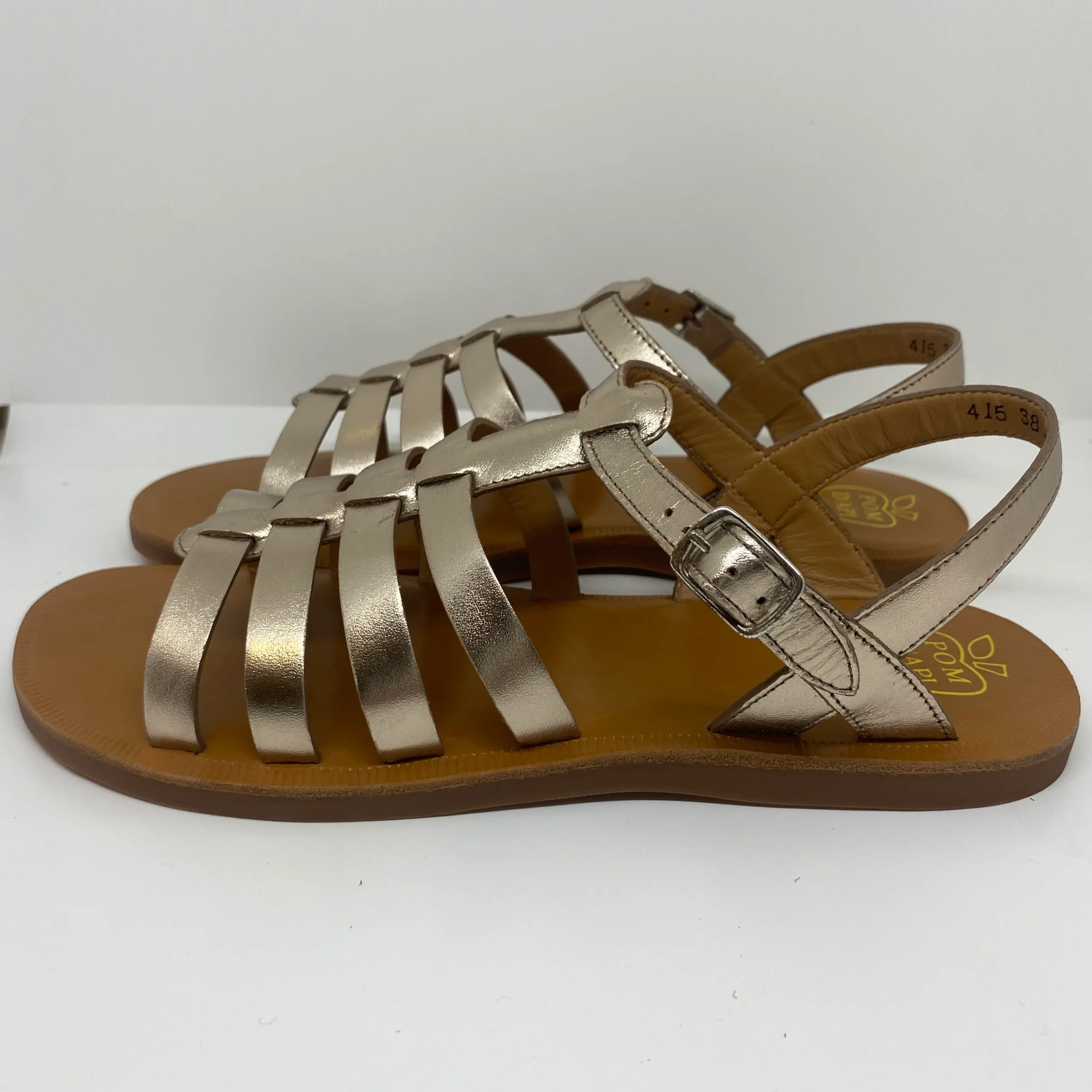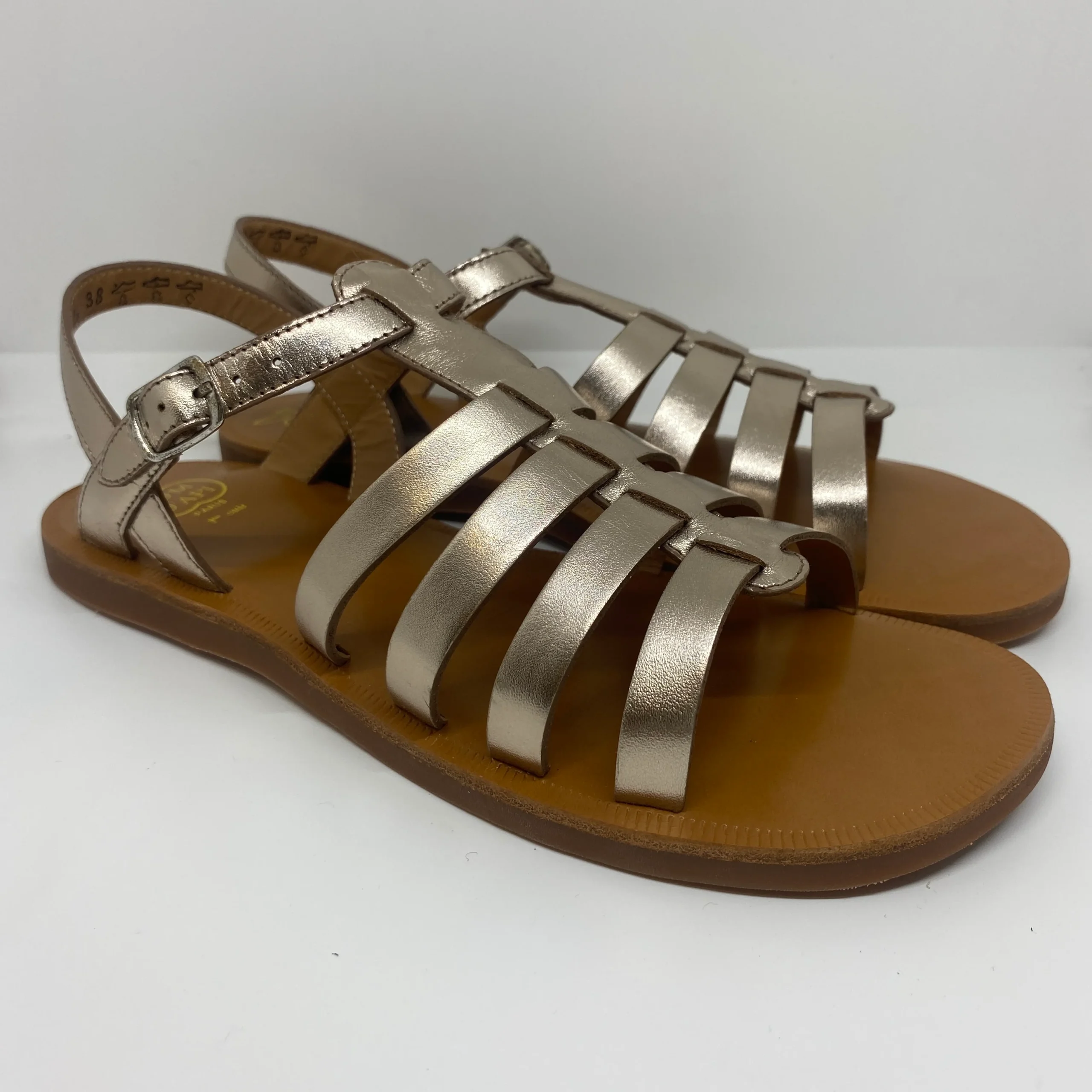 Sandales nus pieds, façon spartiates, en cuir uni irisé light gold, qui s’ajuste facilement à la cheville grâce à une fermeture à boucle réglable.