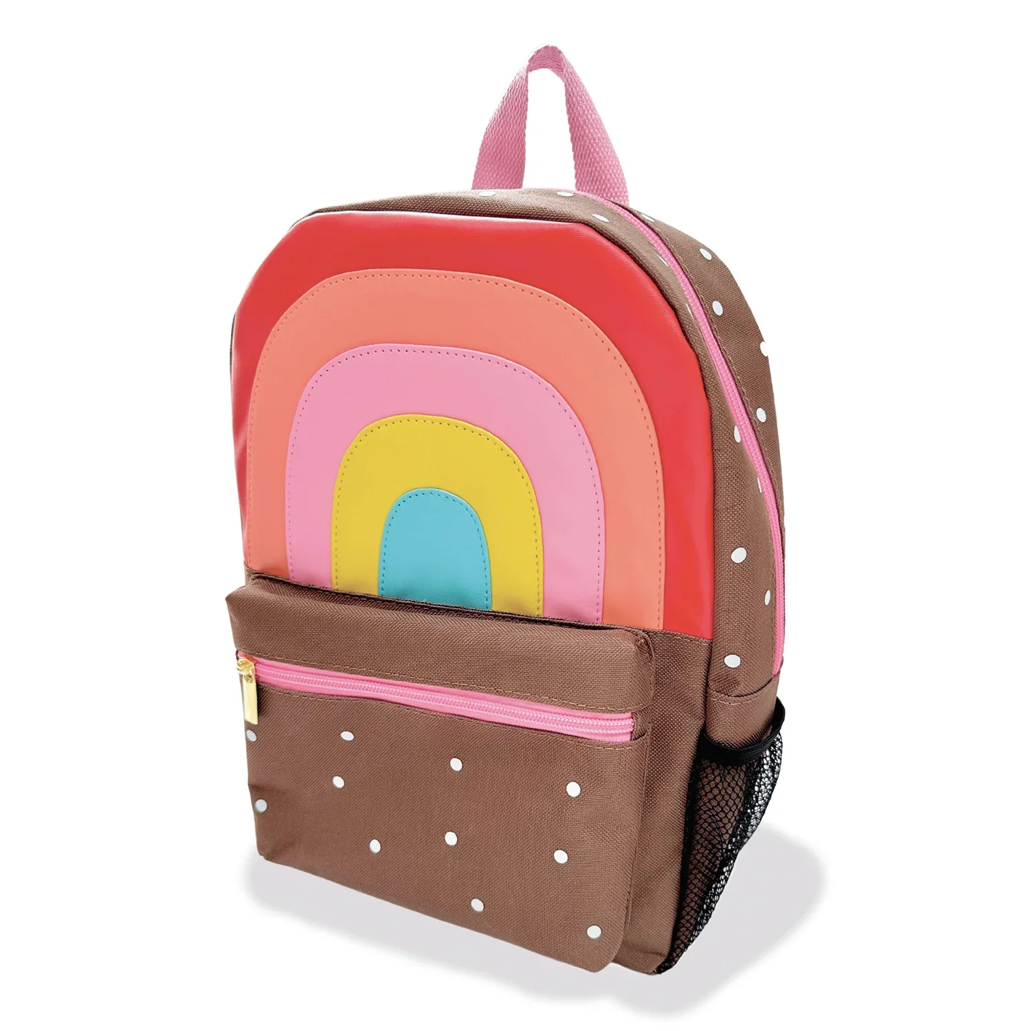 Sortez avec un style colorĂ© grĂ¢ce Ă notre amusant sac Ă dos arc-en-ciel ! FabriquĂ© dans un beau tissu marron Ă pois reprĂ©sentant un joyeux arc-en-ciel, ce sac Ă dos est entièrement doublĂ© de notre joli motif en forme de cÅ“ur et comporte une poignĂ©e de transport, une poche frontale, des filets Ă bouteilles et des bretelles rĂ©glables.