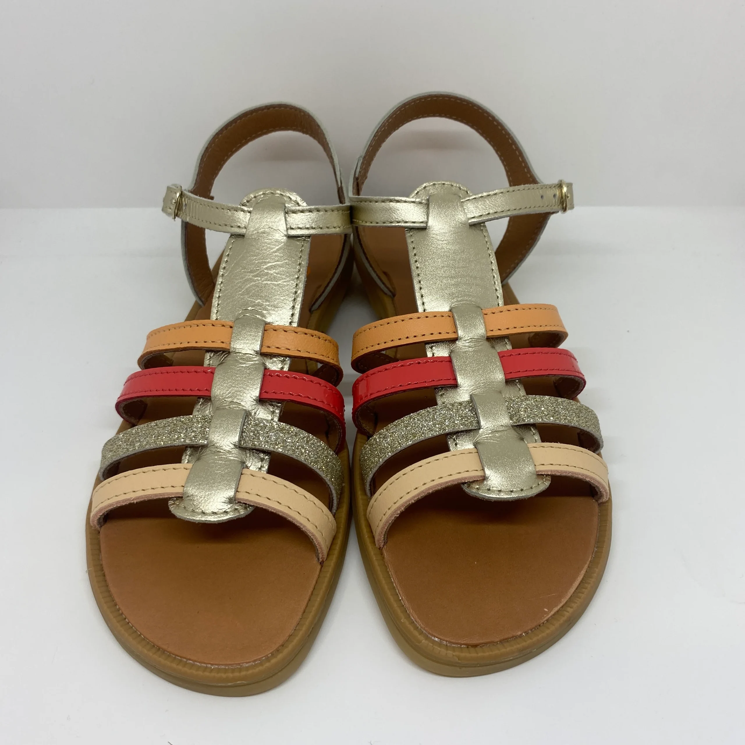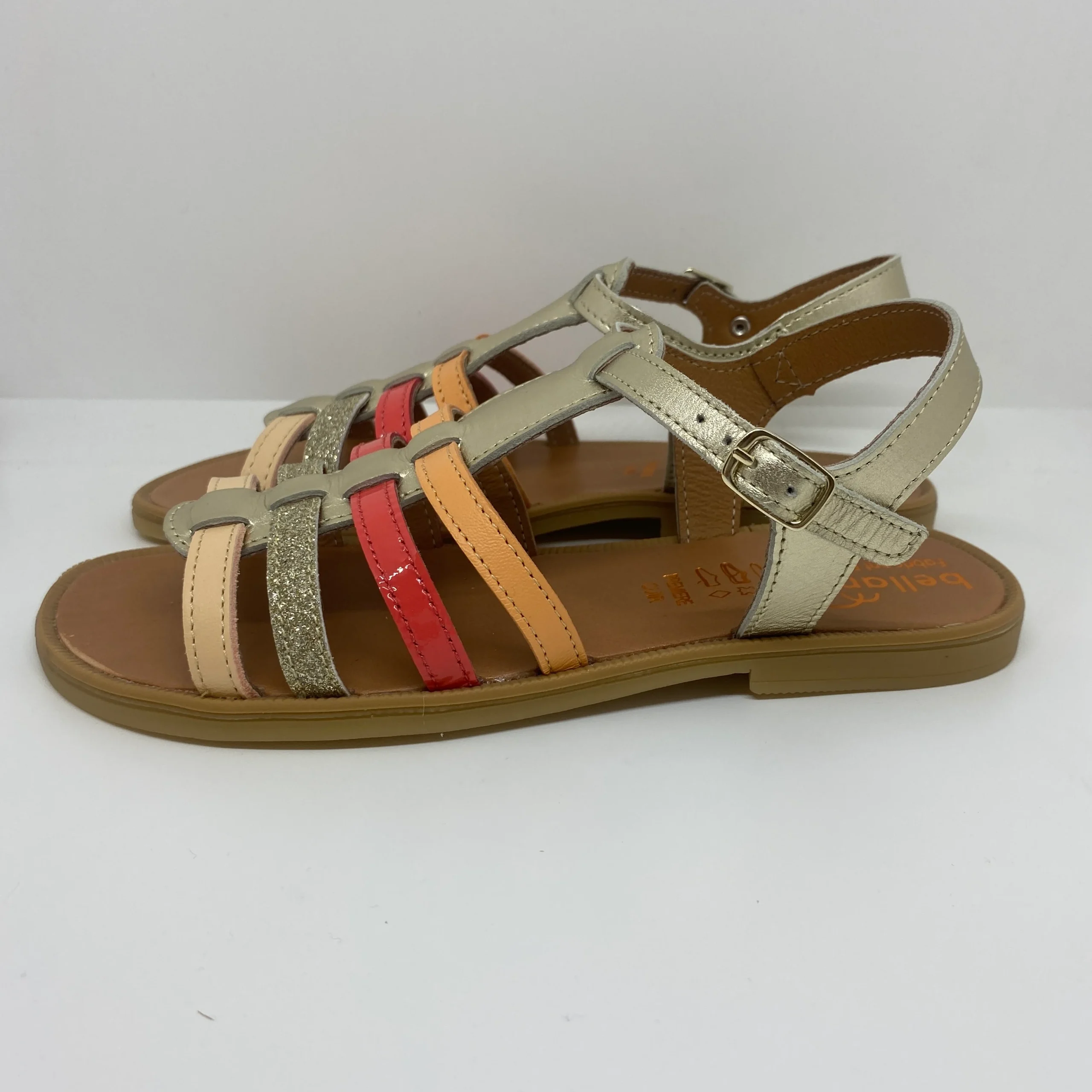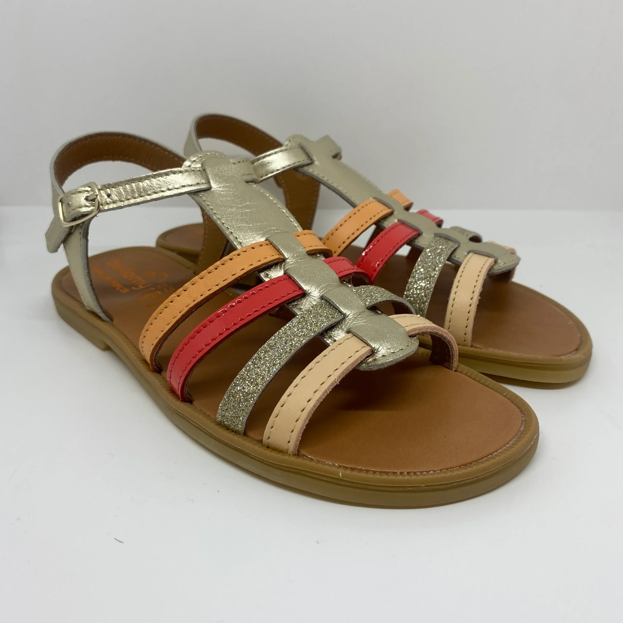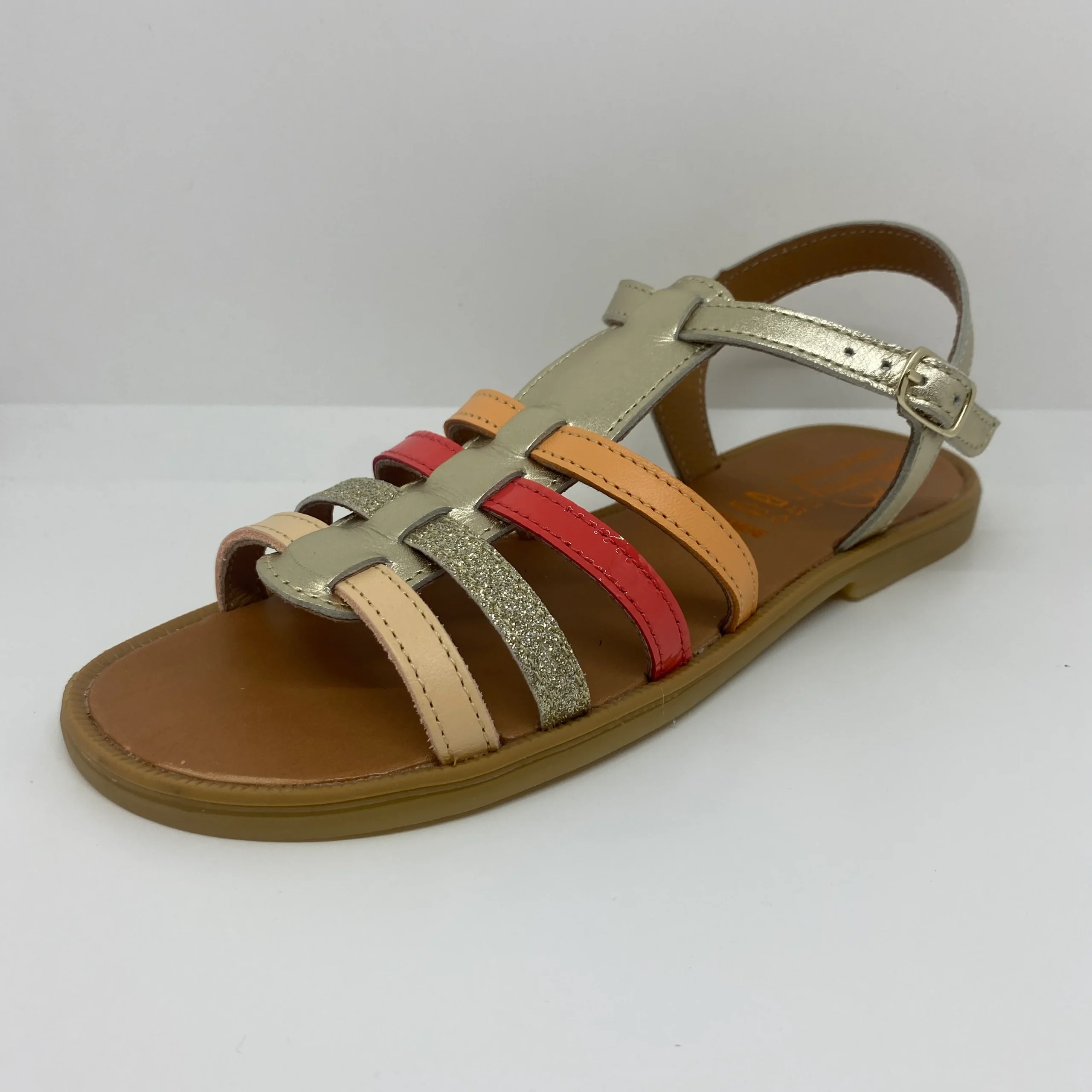 Ces nu-pieds type spartiates en cuir sont un véritable coup de cœur pour les plus grandes qui aiment allier style intemporel, confort et maintien. Avec leurs lanières multicolores en cuir irisé doré et orangé, elles apportent une touche féminine, légère et pleine de style à toutes les tenues estivales.