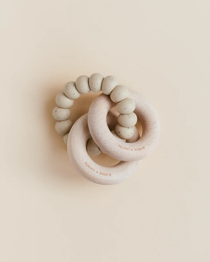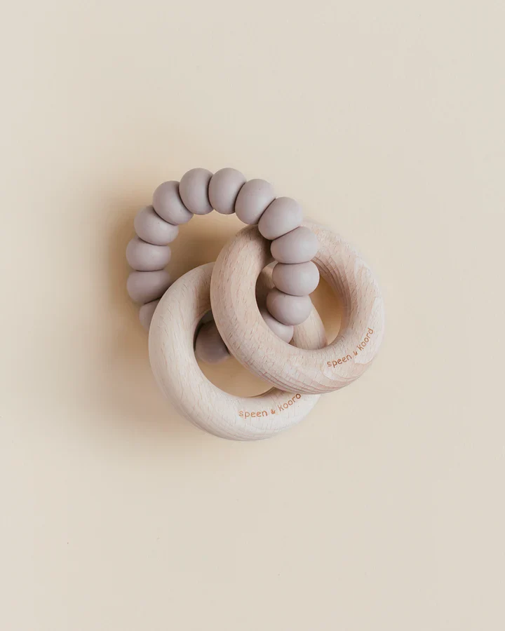 Les billes de silicone souples sont idéales pour la dentition et les anneaux en bois font un joli bruit de cliquetis lorsqu’ils sont déplacés. Bien entendu, les anneaux en bois peuvent également être portés à la bouche.