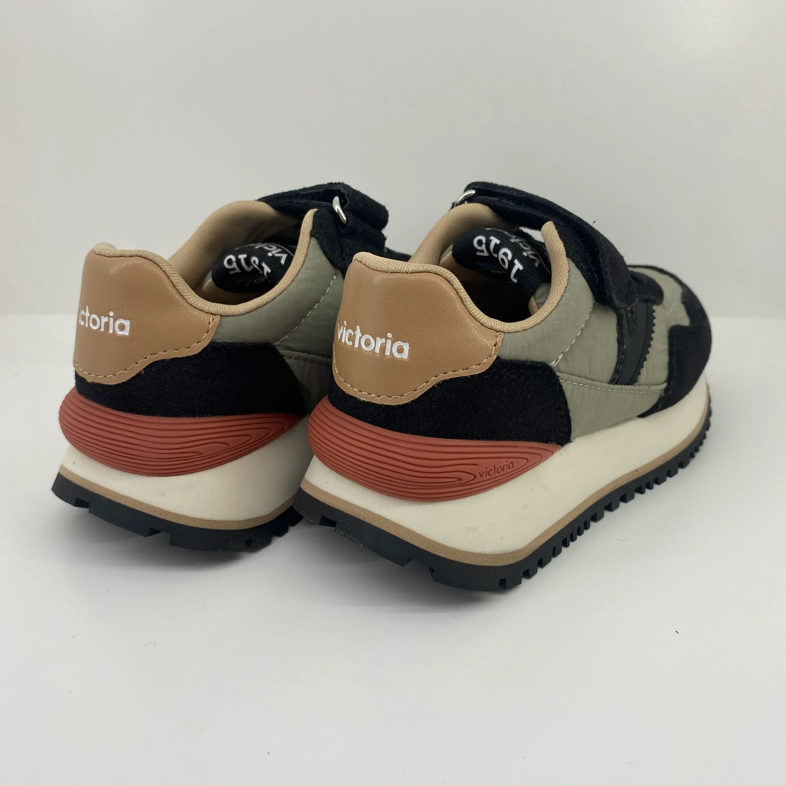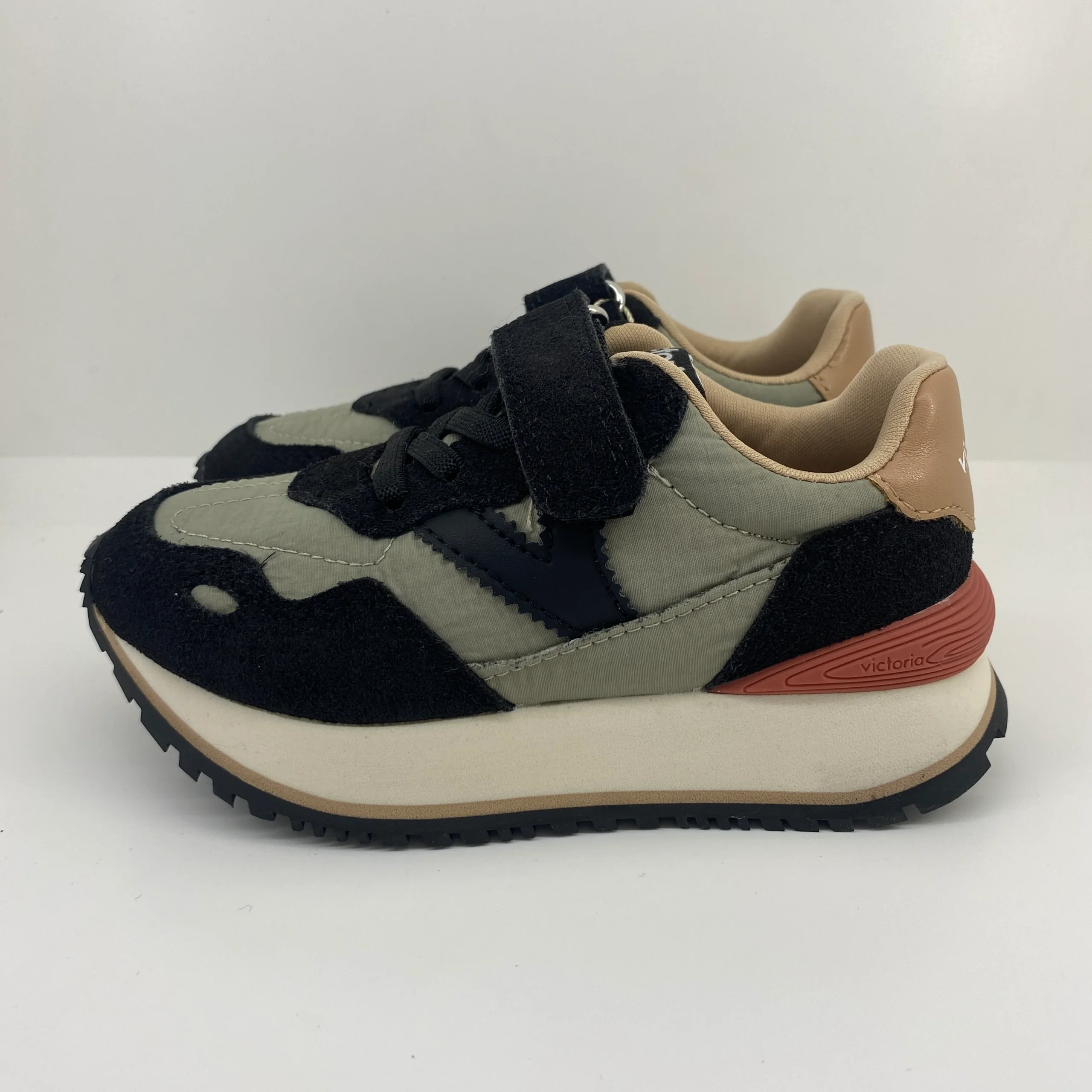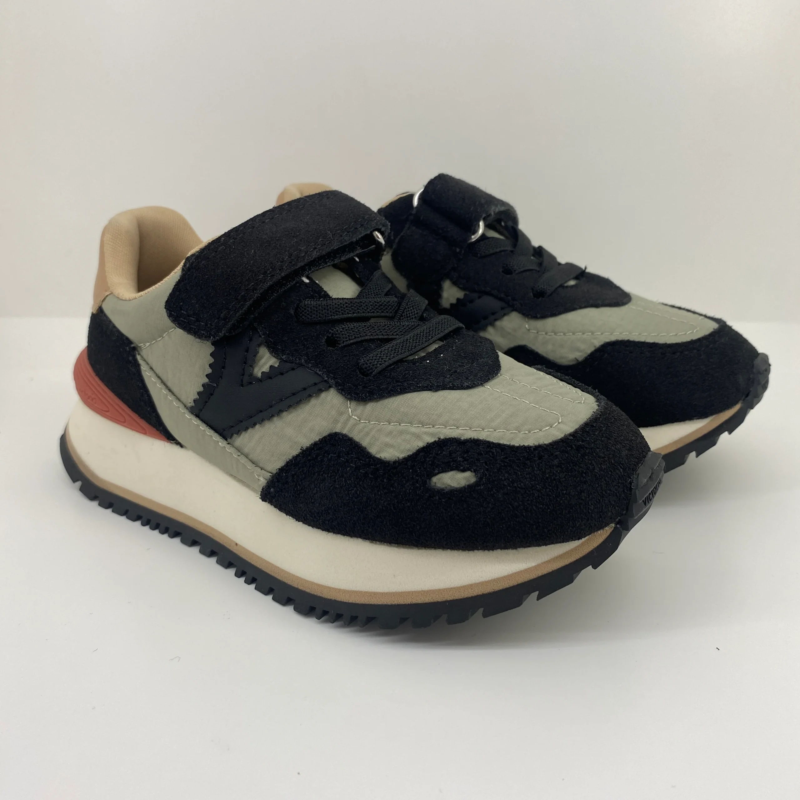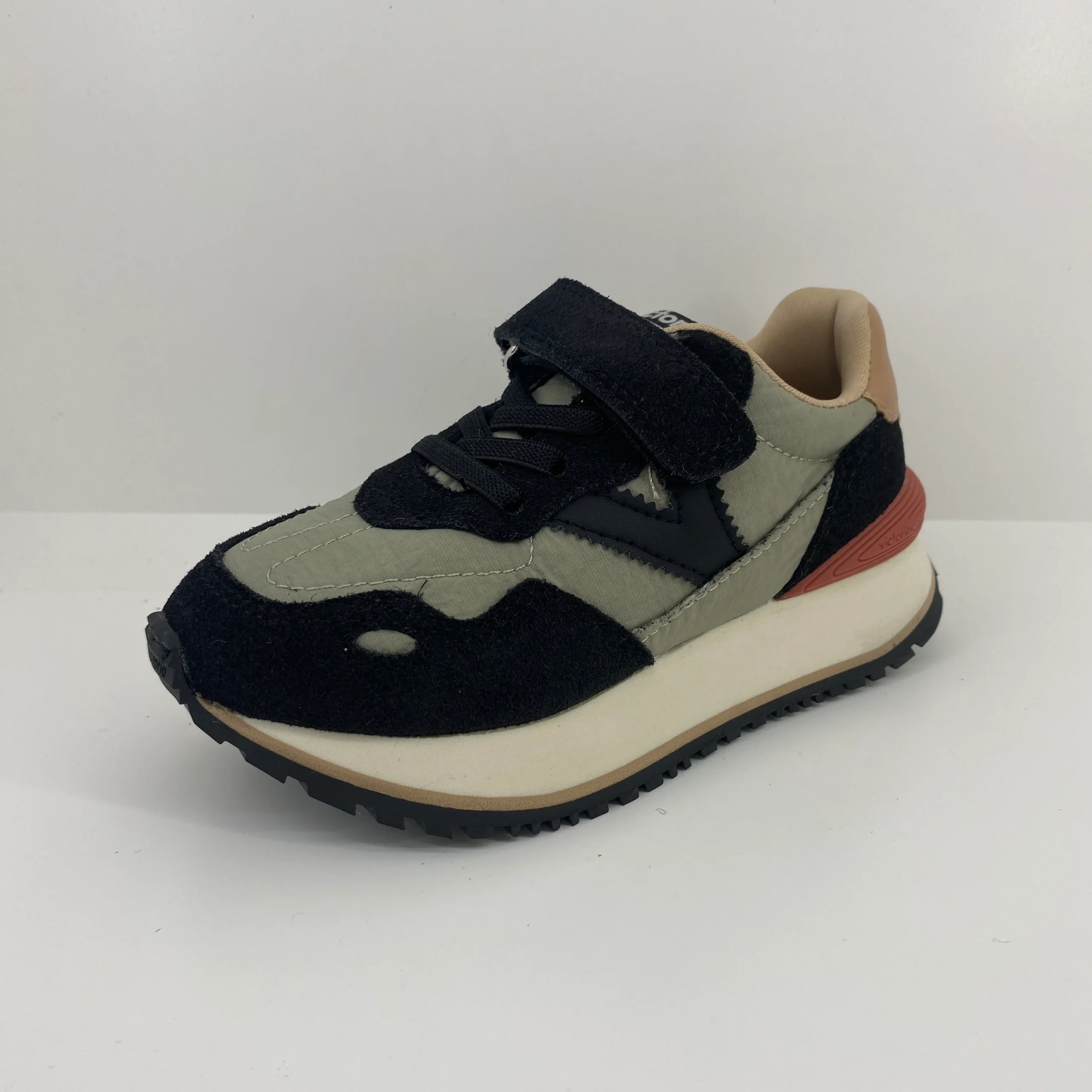 Baskets basses, légères, à fermeture avec des lacets élastiques et une bande velcro, confectionnés avec un mélange de nylon, daim et matériau effet cuir, rehaussées par des détails comme la semelle large et le stabilisateur de talon.